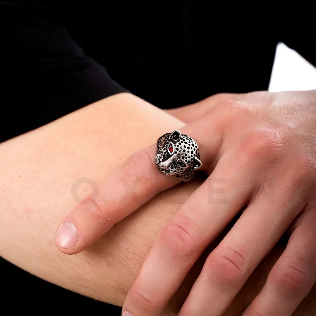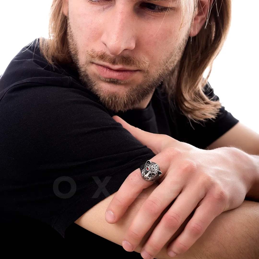Δαχτυλίδι ανδρικό από ανοξείδωτο ατσάλι ασημί πάνθηρας με κόκκινα μάτια