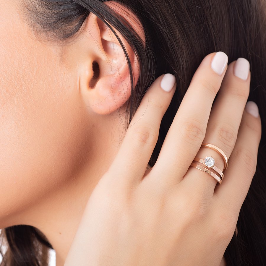 Δαχτυλίδι ατσάλινο σε ροζ χρυσό τριπλό με πέτρα ζιργκόν
