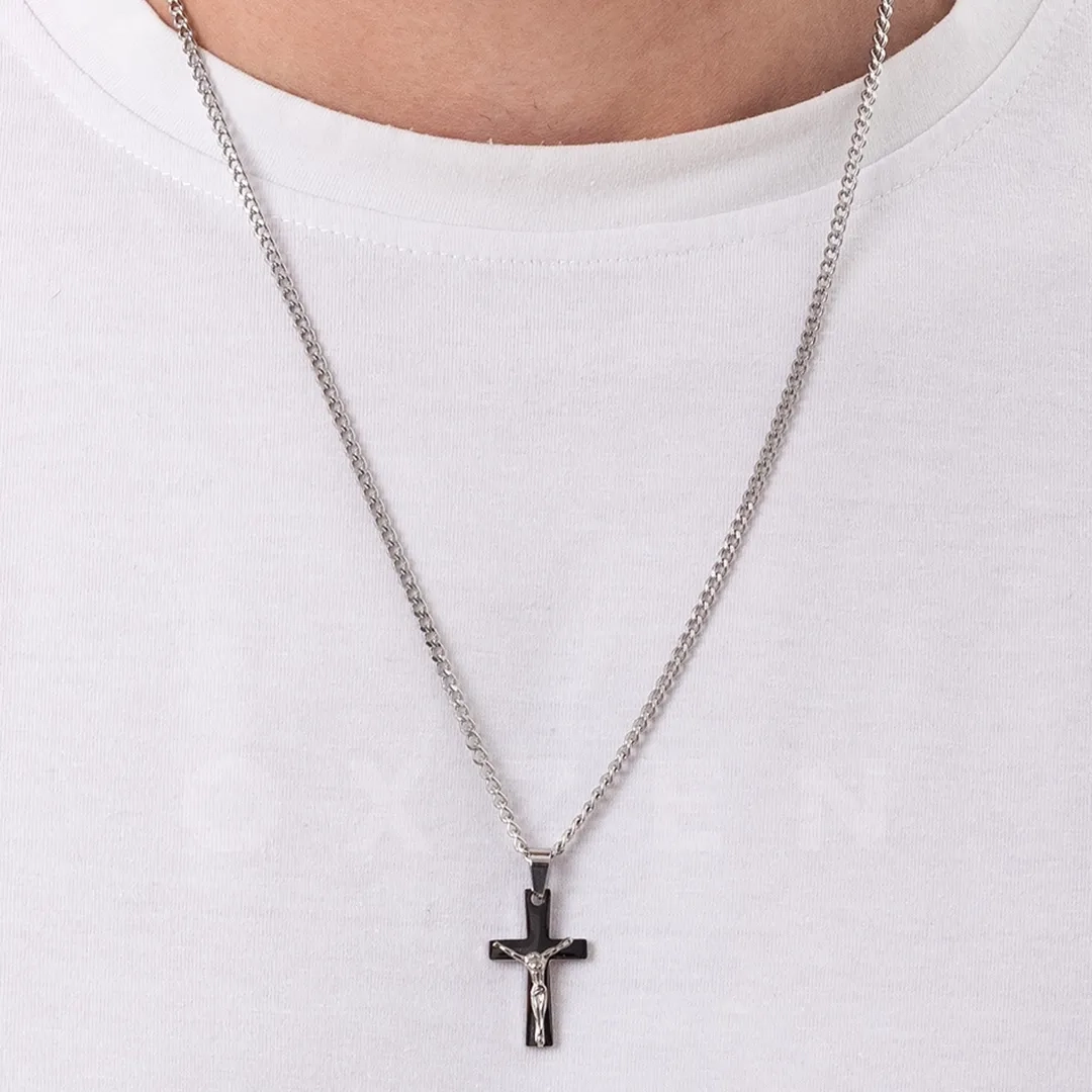 Κολιέ σταυρός αντρικός ατσάλι σε ασημί με μαύρο