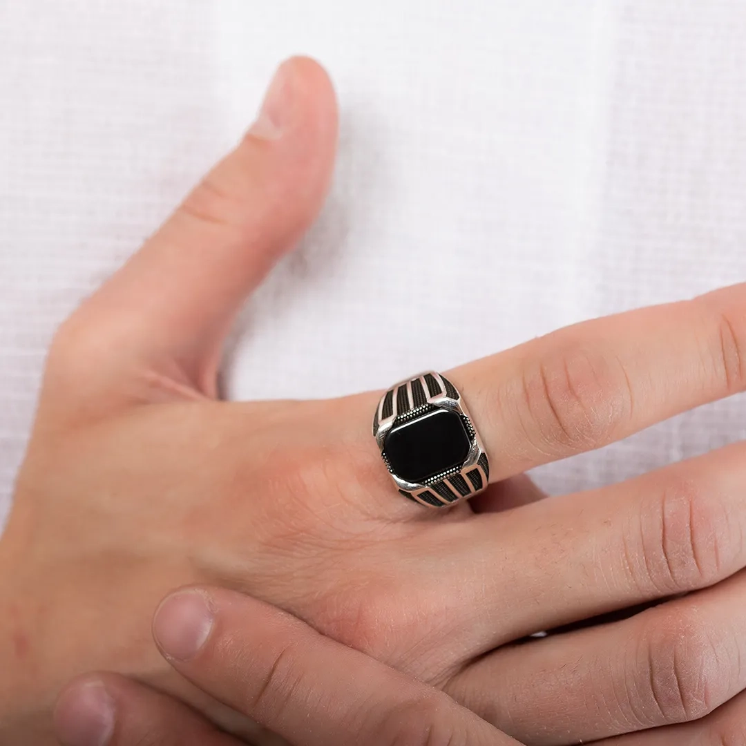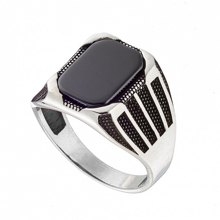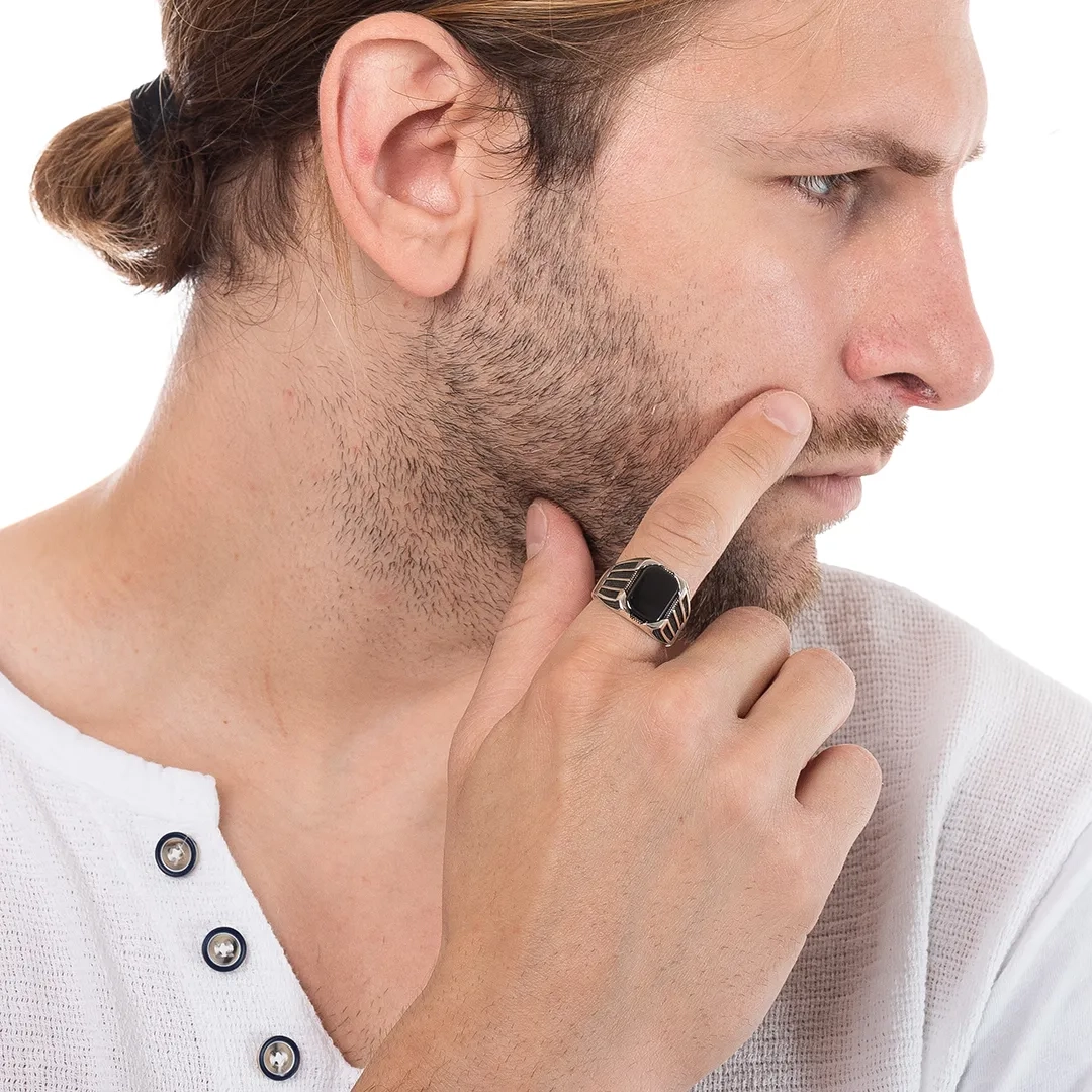 Oxzen ανδρικό δαχτυλίδι ασημένιο, με ορθογώνια πέτρα μαύρο αχάτη