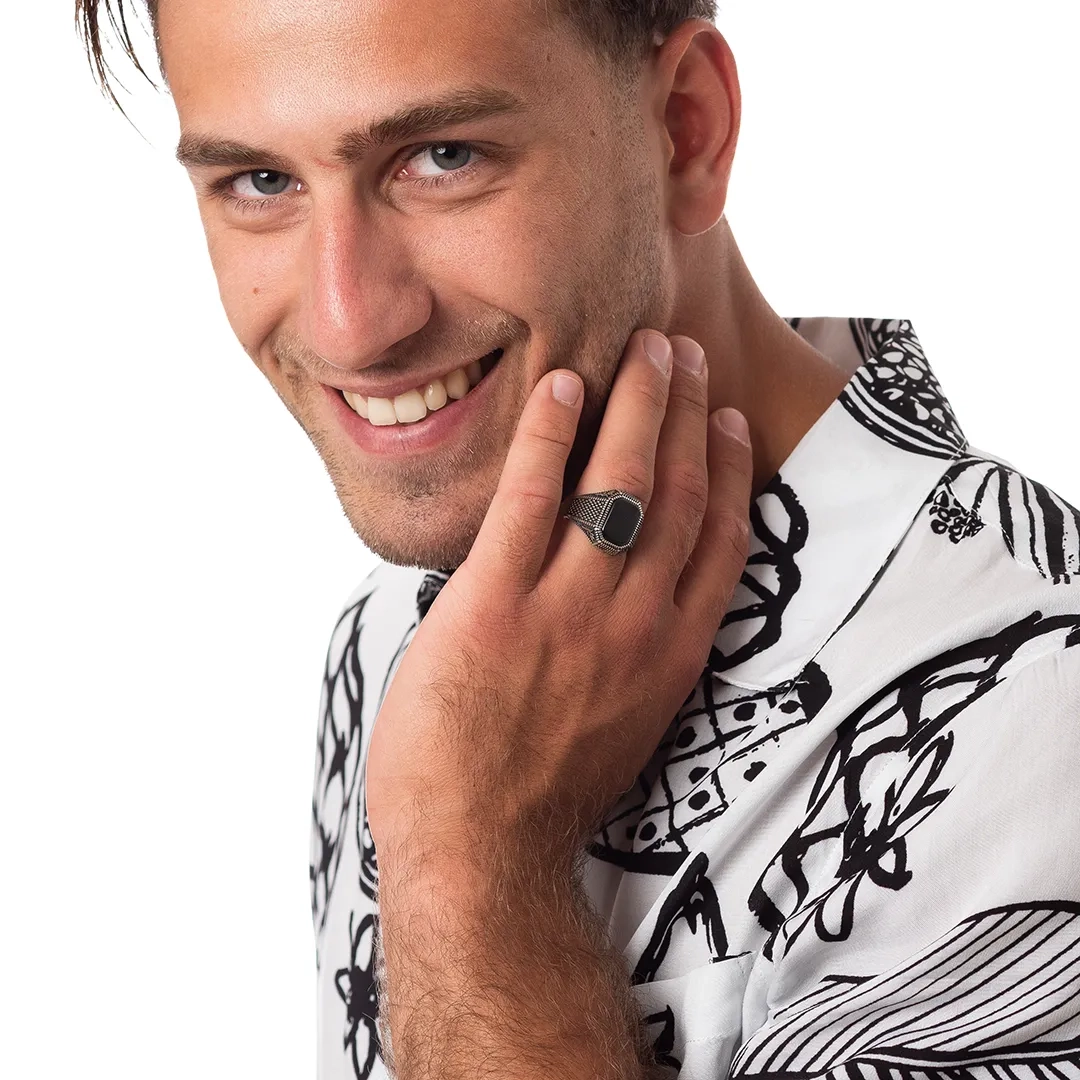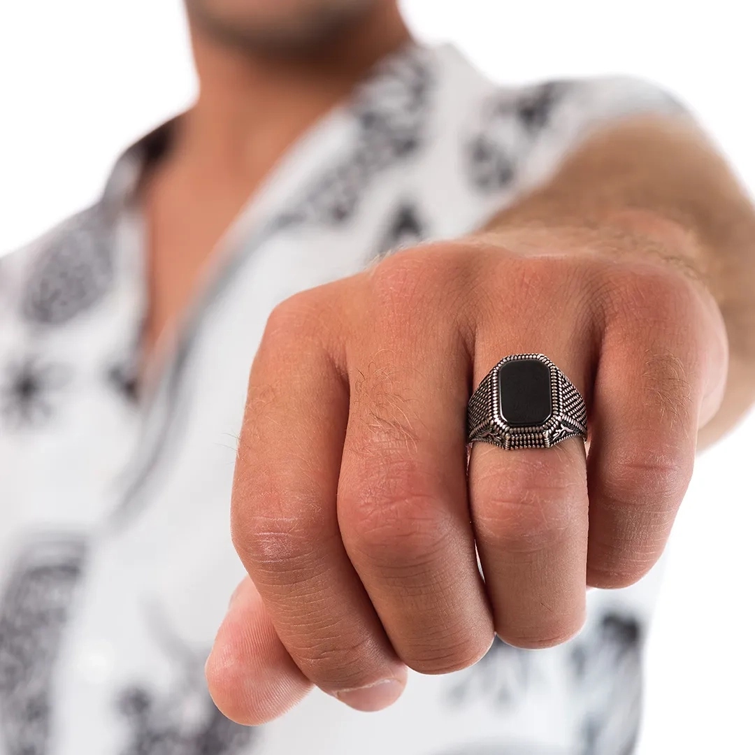 Oxzen ανδρικό δαχτυλίδι ασημένιο, με ορθογώνια πέτρα μαύρο αχάτη