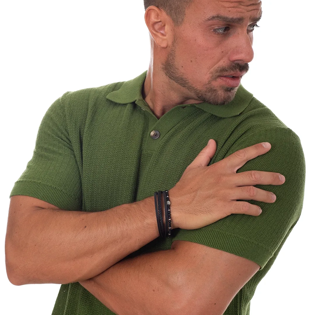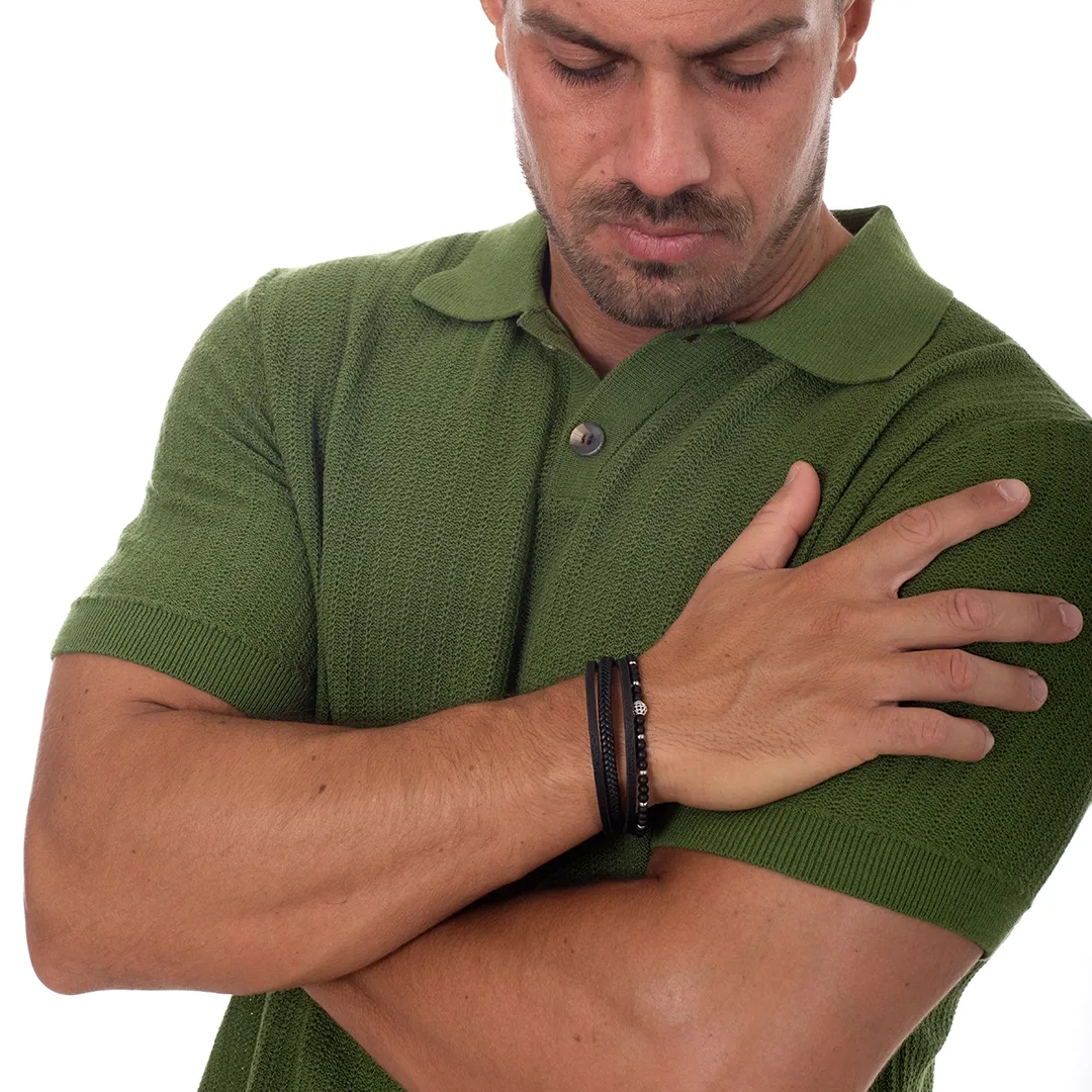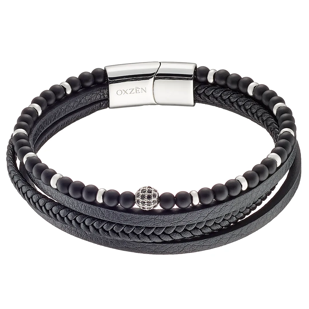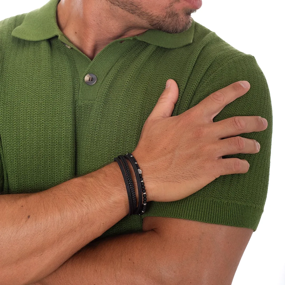 Βραχιόλι ατσάλινο με δέρμα μαύρο πενταπλό