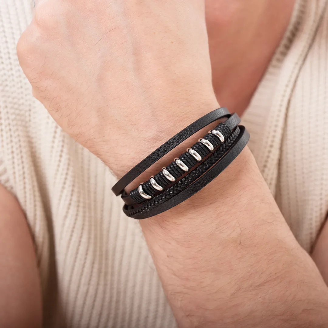 Βραχιόλι ατσάλινο με δέρμα μαύρο πενταπλό