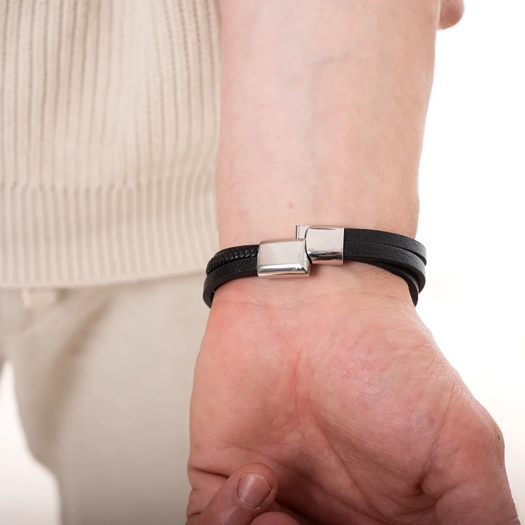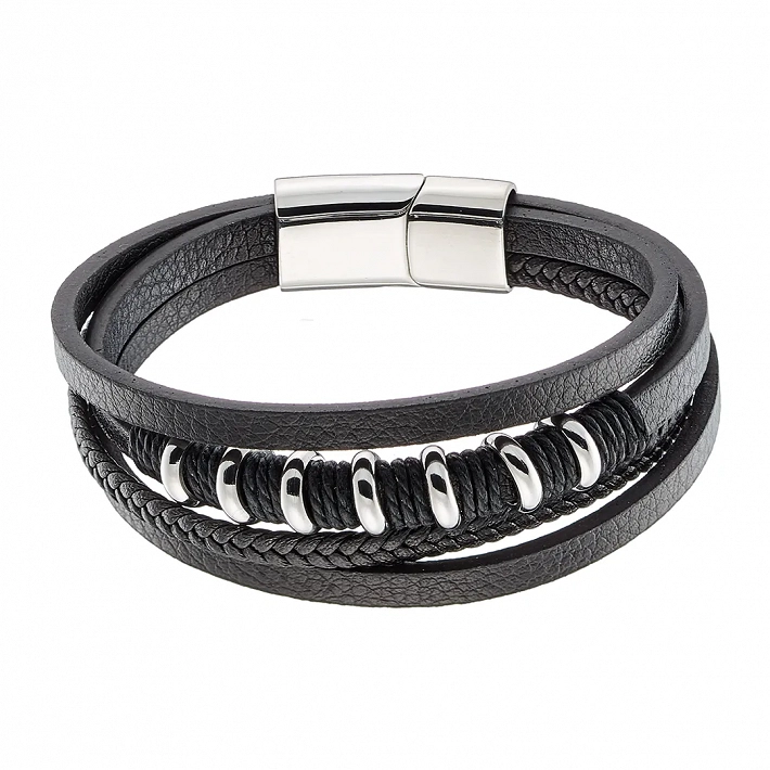 Βραχιόλι ατσάλινο με δέρμα μαύρο και κούμπωμα μαγνήτη