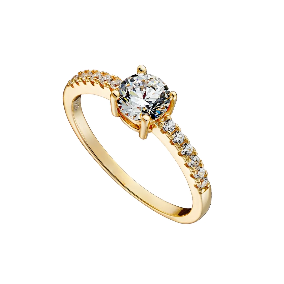Oxzen ασημένιο δαχτυλίδι επιχρυσωμένο μονόπετρο με λευκό ζιργκόν 6mm