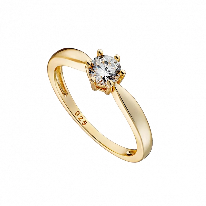 Oxzen ασημένιο δαχτυλίδι επιχρυσωμένο μονόπετρο με λευκό ζιργκόν 6mm