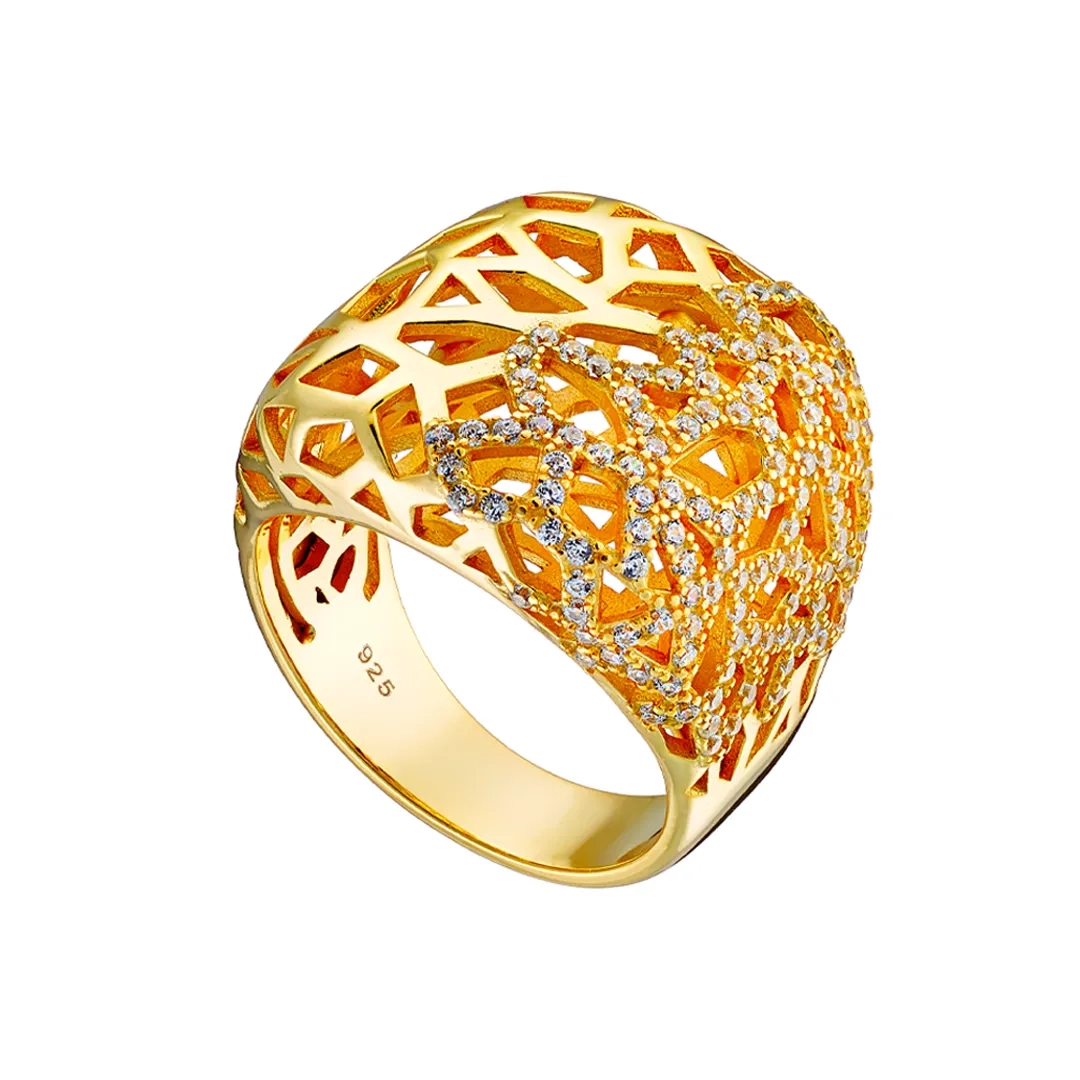 Oxzen ασημένιο δαχτυλίδι επιχρυσωμένο σκαλιστό με λευκά ζιργκόν