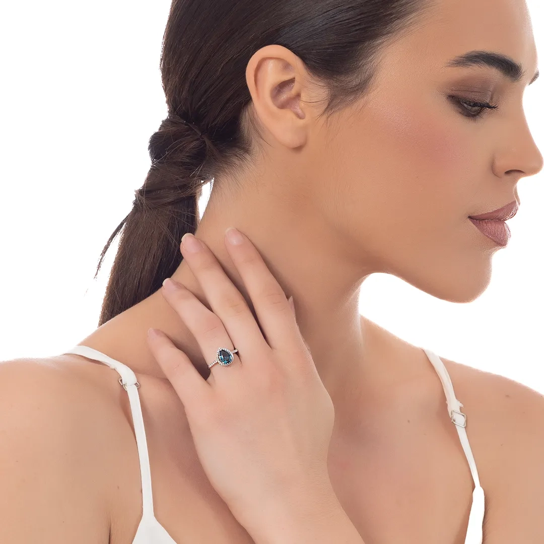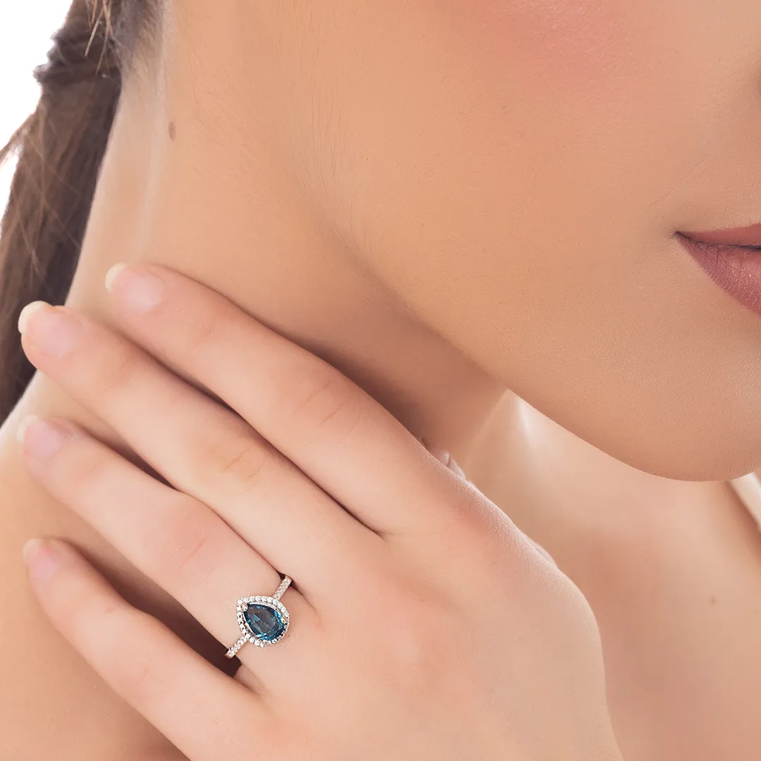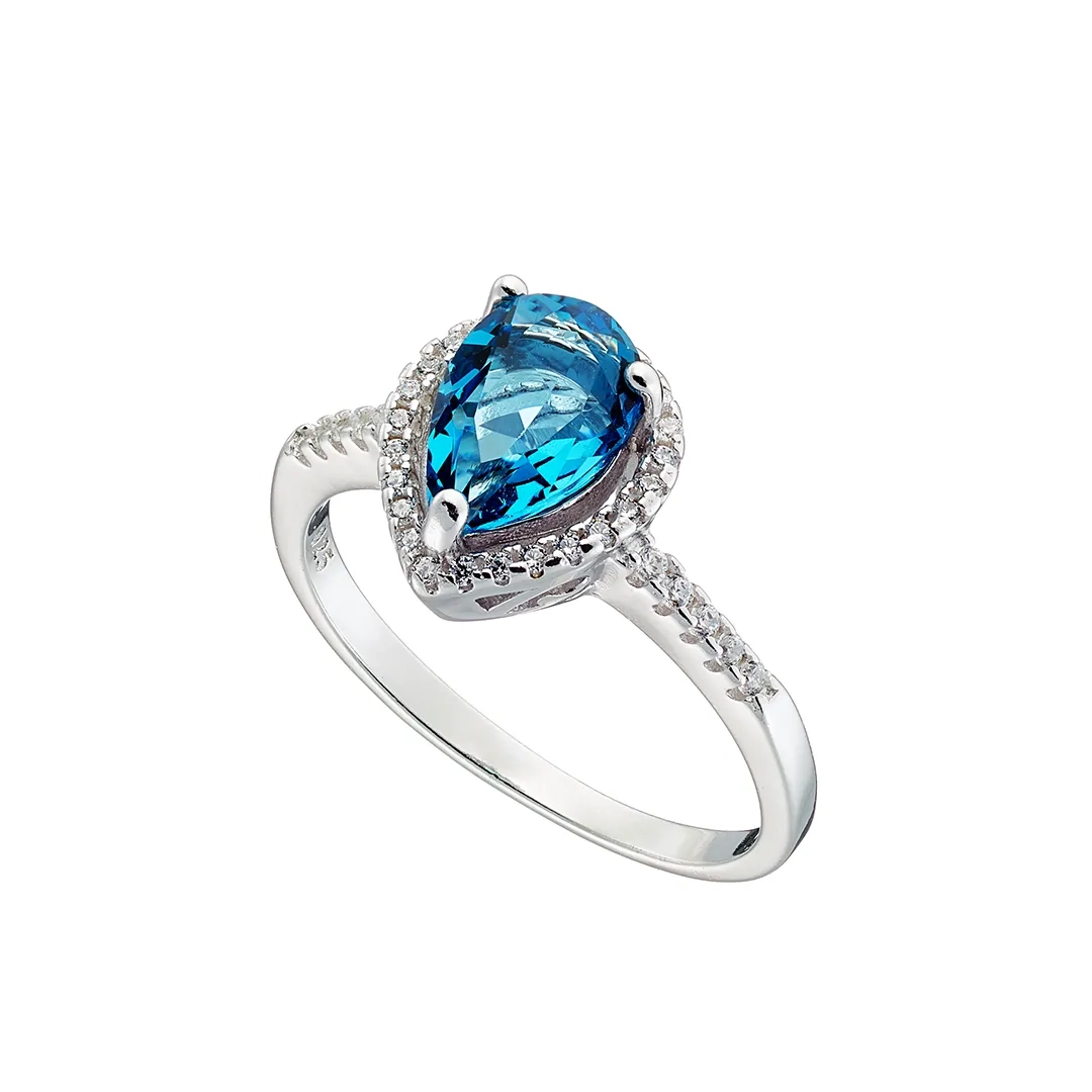 Oxzen ασημένιο δαχτυλίδι μονόπετρο δάκρυ με πέτρα blue topaz