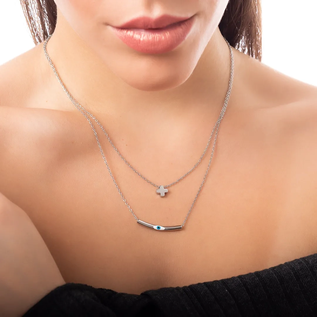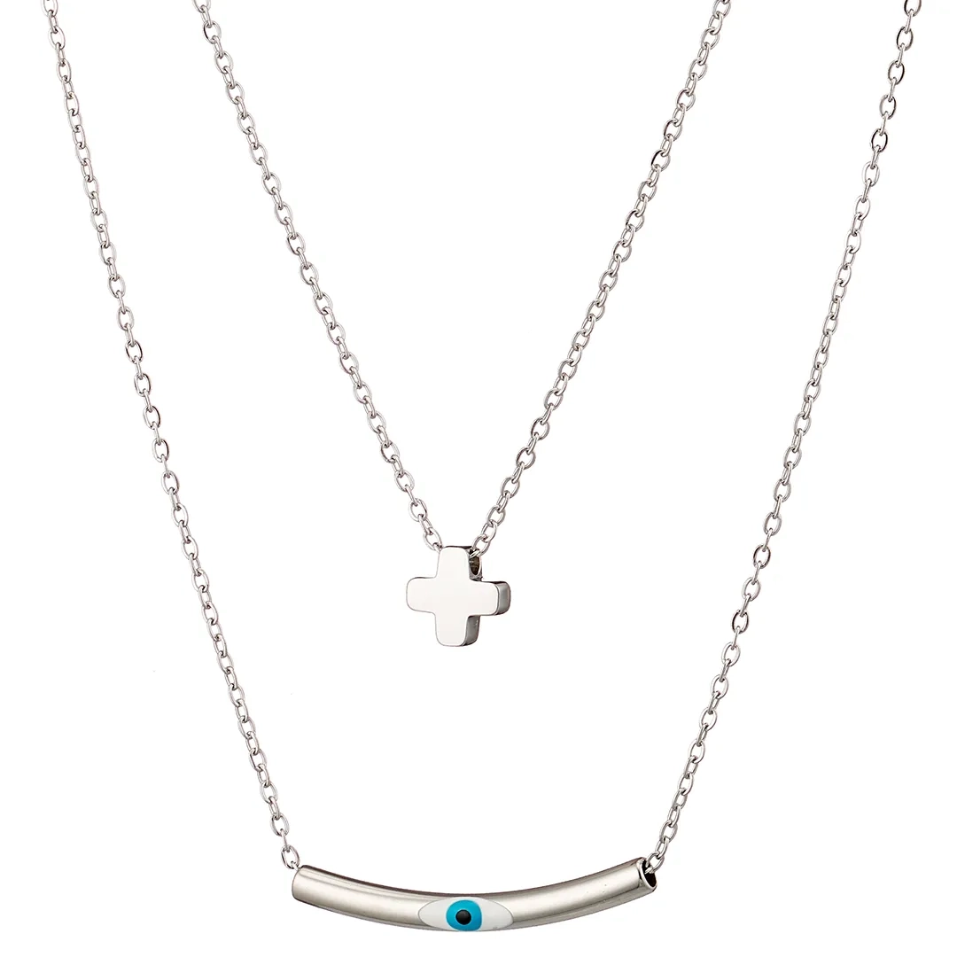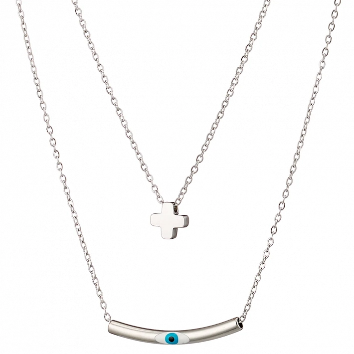 Oxzen ατσάλινο κολιέ διπλό με ματάκι και σταυρό σε ιδιαίτερο σχήμα