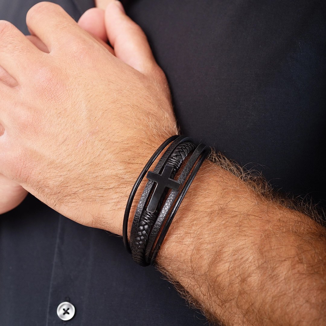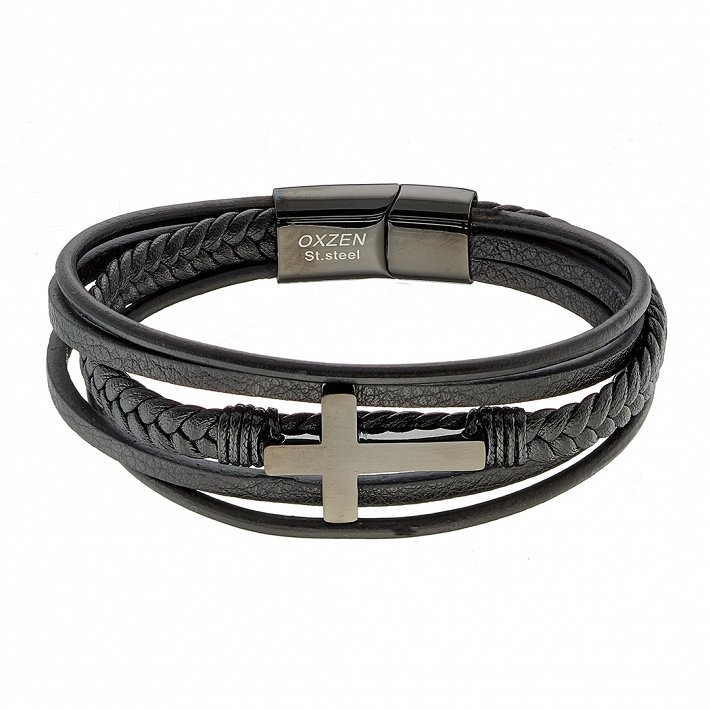 Βραχιόλι ατσάλινο με δέρμα μαύρο πενταπλό
