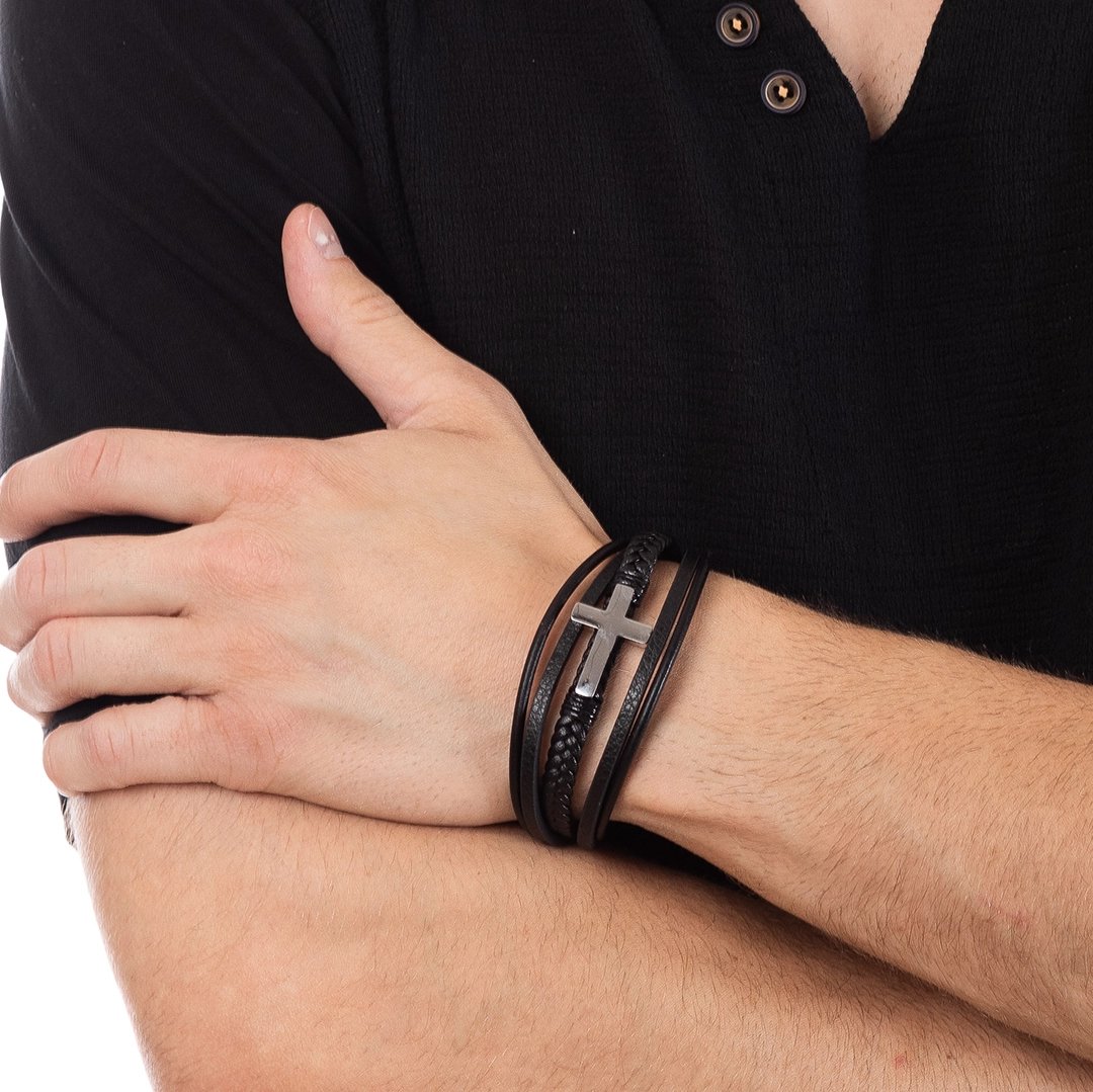 Oxzen δερμάτινο ανδρικό βραχιόλι από ανοξείδωτο ατσάλι με σταυρό
