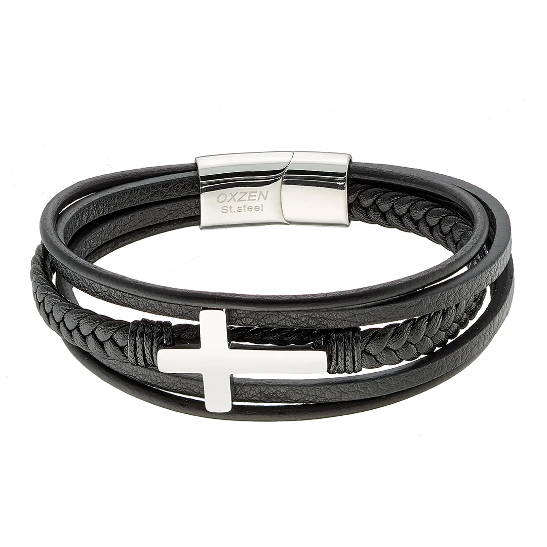 Βραχιόλι ατσάλινο με δέρμα μαύρο πενταπλό