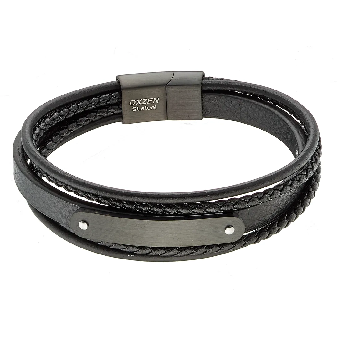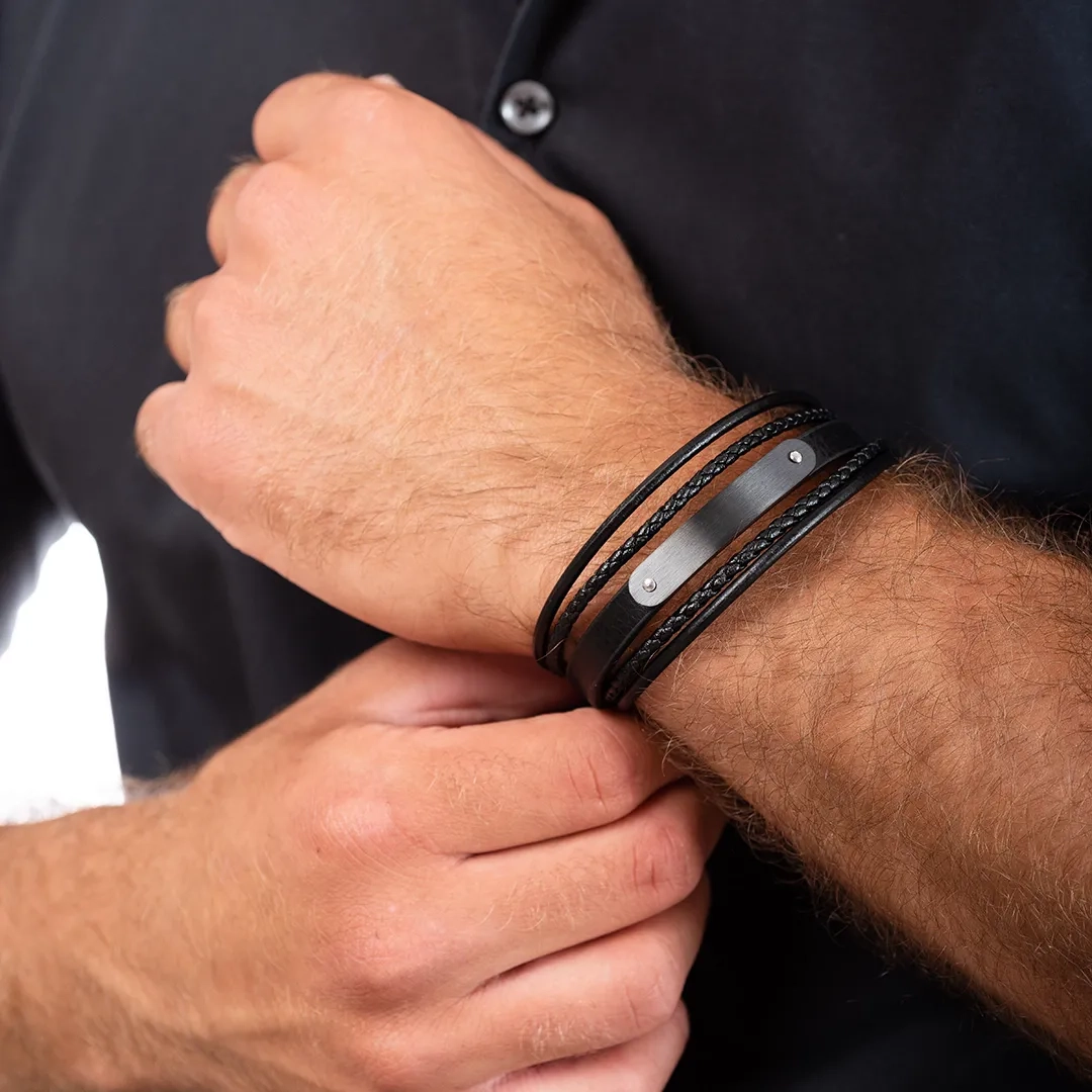 Βραχιόλι ατσάλινο με δέρμα μαύρο πενταπλό
