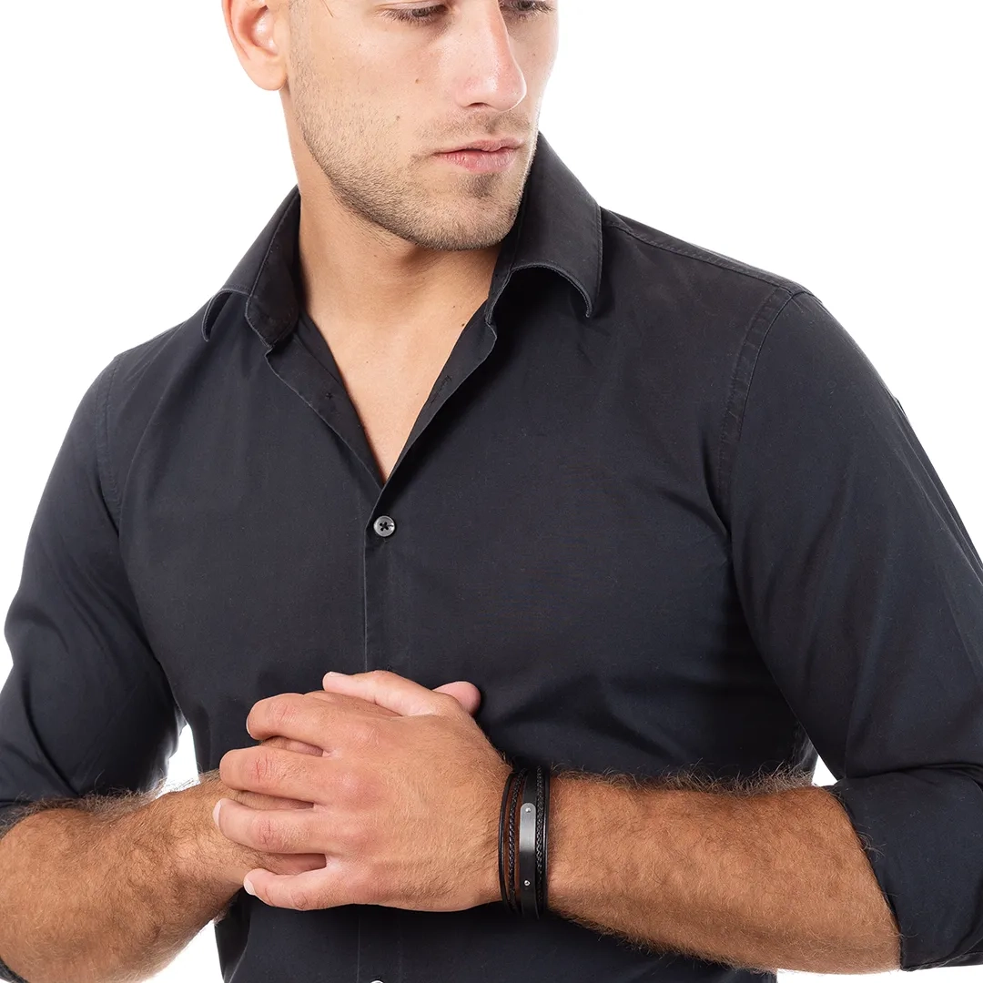 Βραχιόλι ατσάλινο με μαύρο δέρμα τριπλό