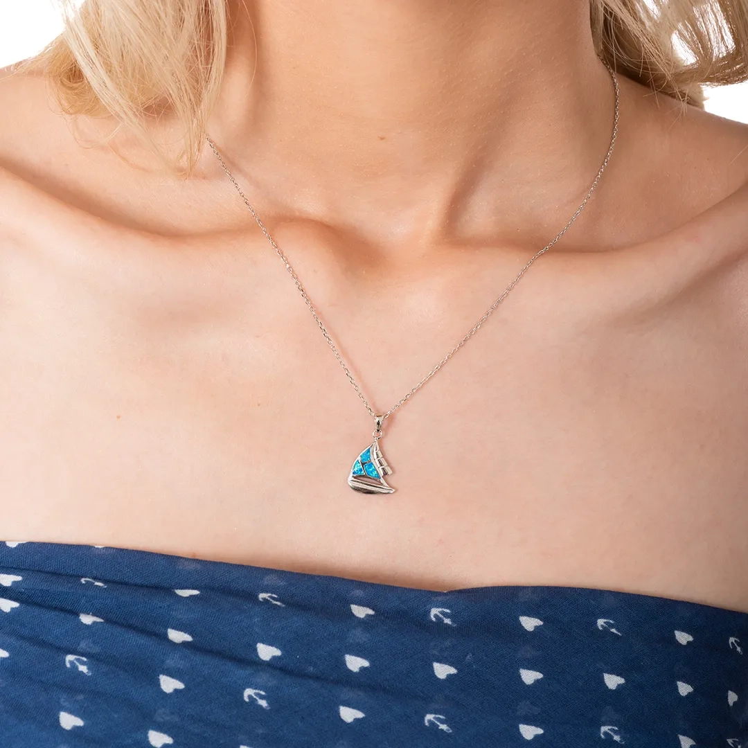 Oxzen γυναικείο κολιέ ασημένιο καραβάκι με γαλάζιο οπάλιο