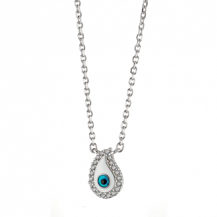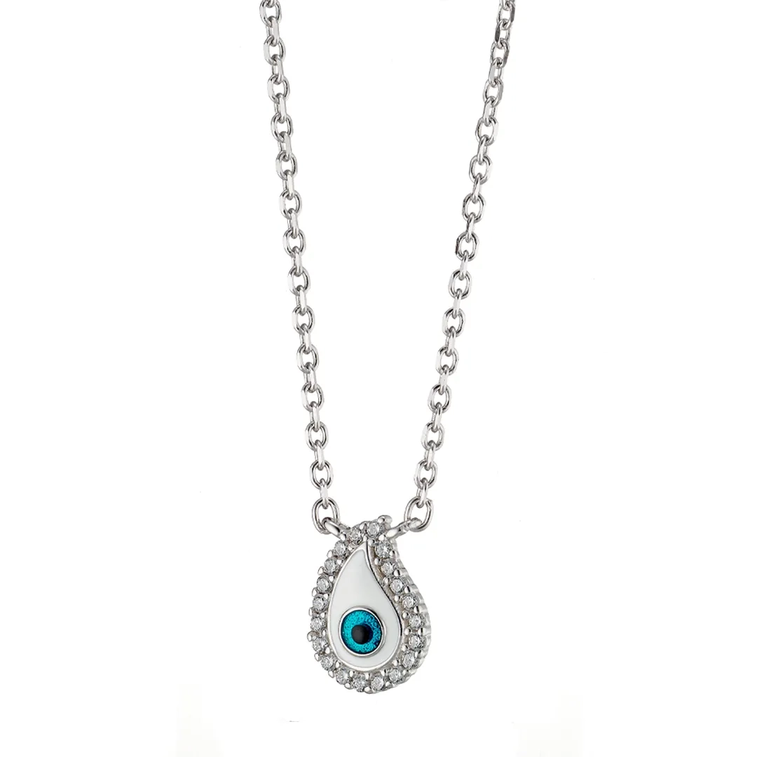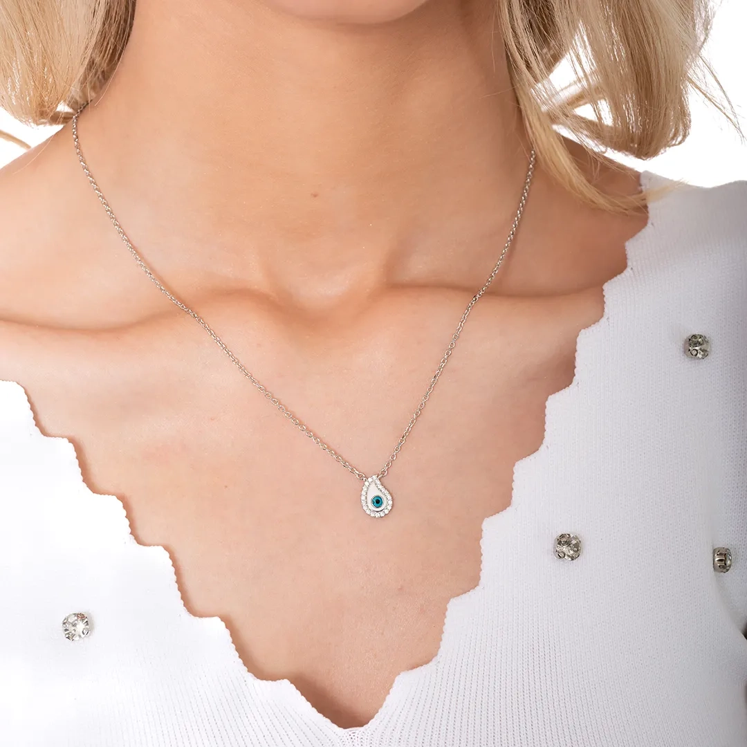 Oxzen γυναικείο κολιέ ασημένιο λευκό ματάκι με λευκά ζιργκόν