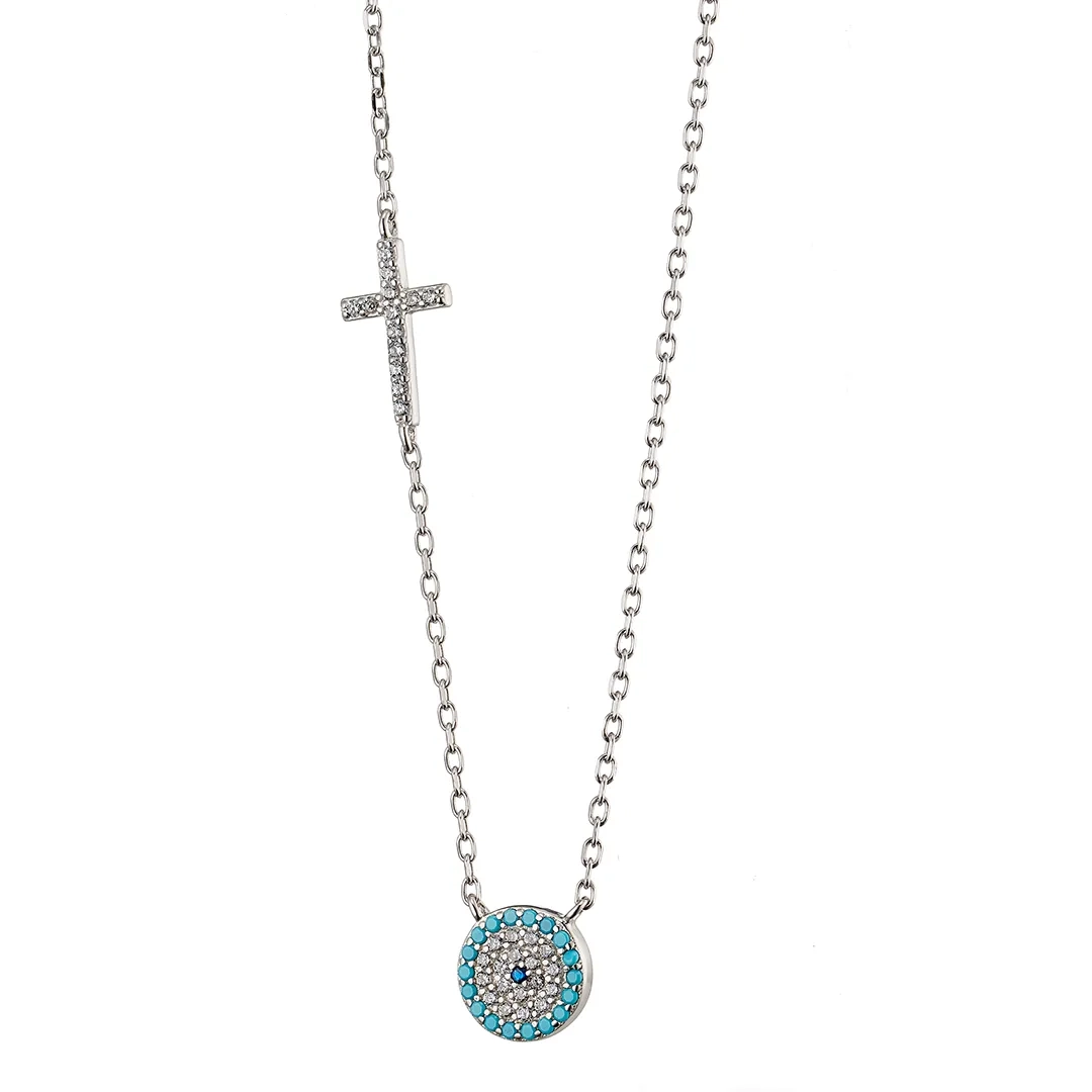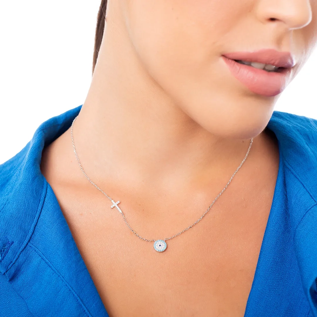 Oxzen γυναικείο κολιέ ασημένιο ματάκι με σταυρό και λευκά ζιργκόν
