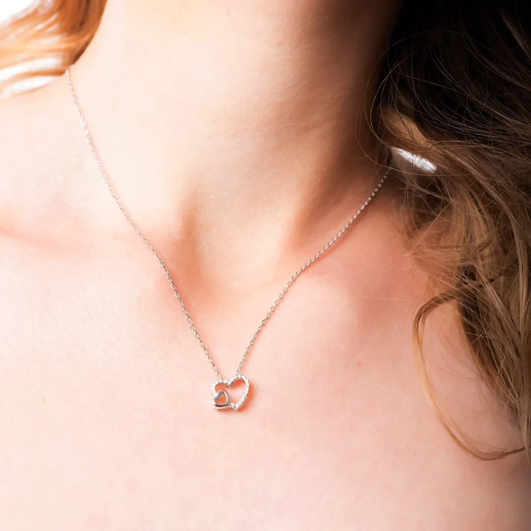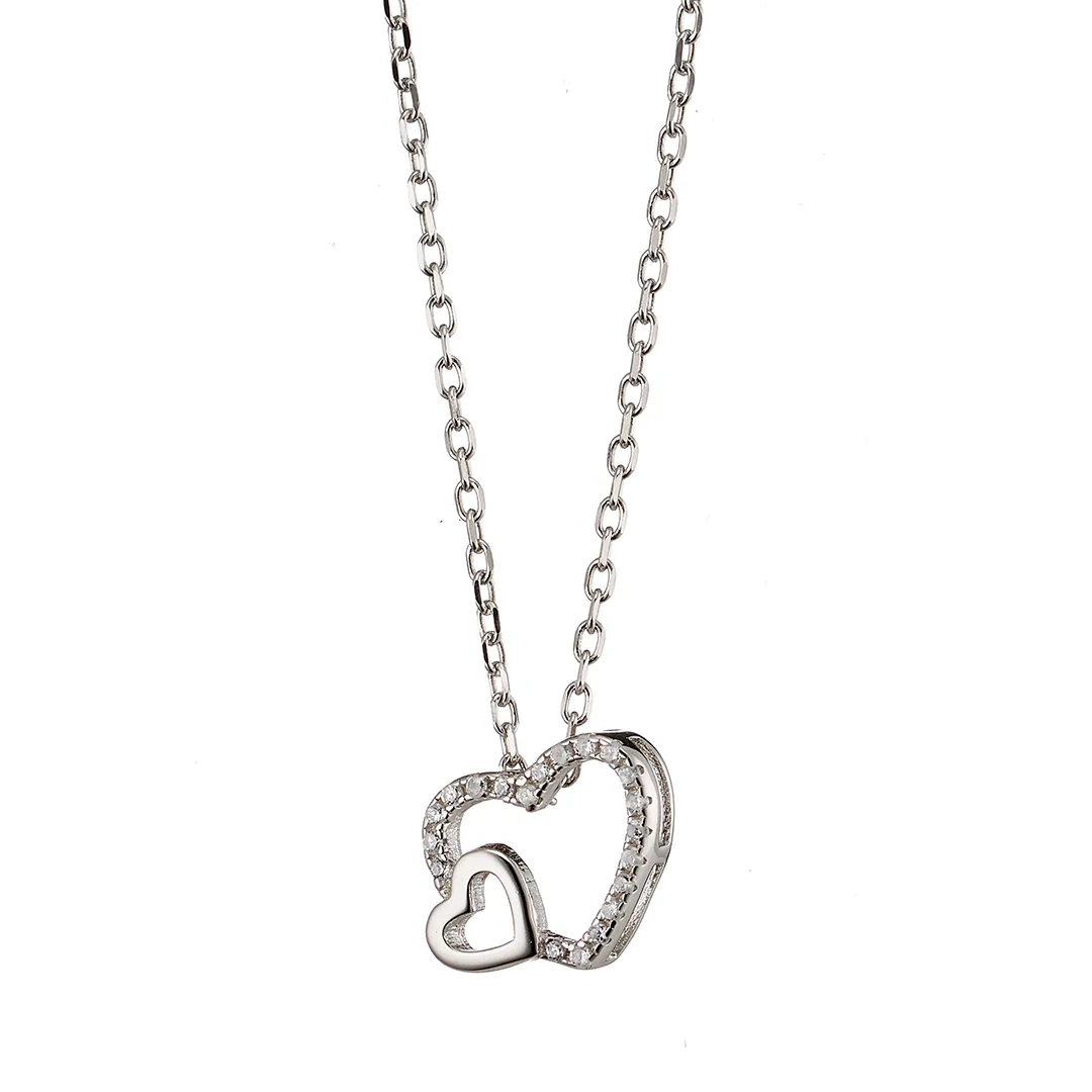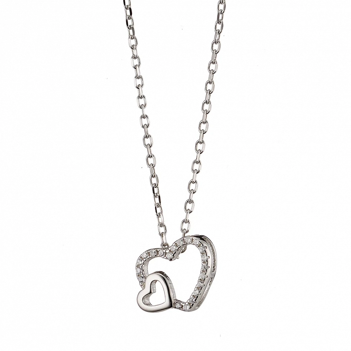 Oxzen γυναικείο κολιέ ασημένιο με διπλή καρδιά και λευκά ζιργκόν