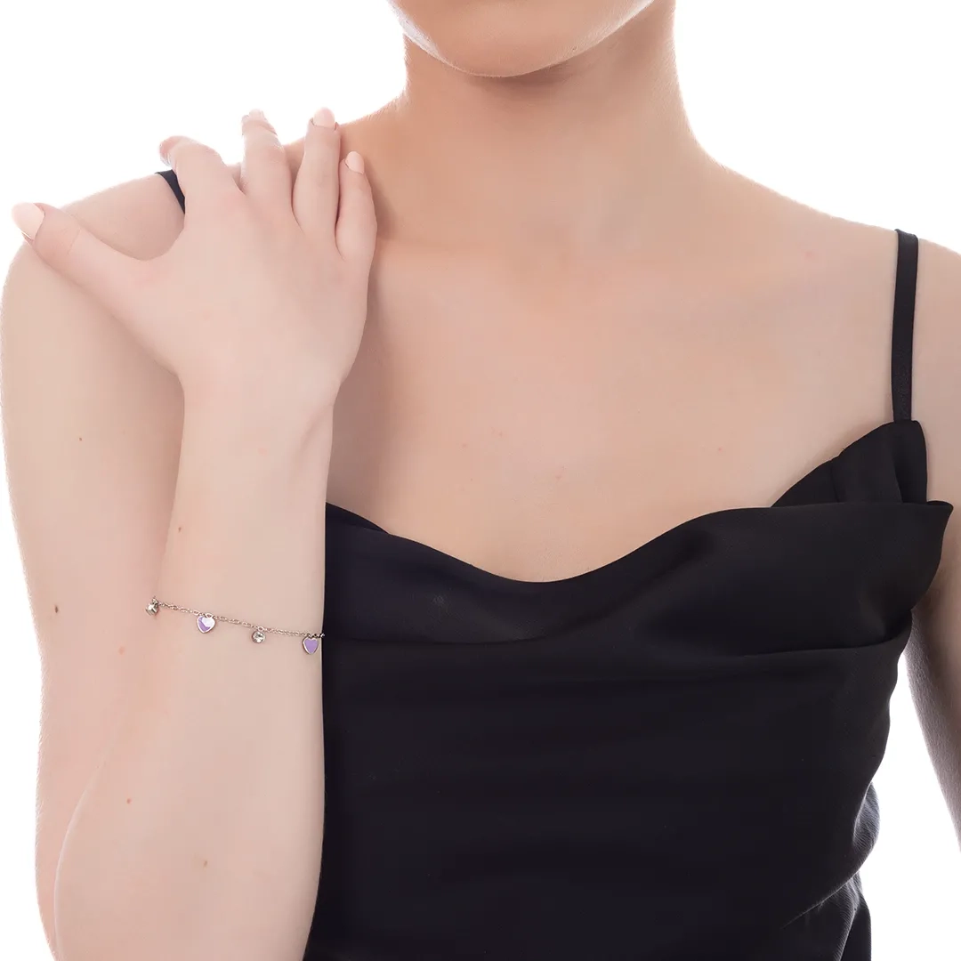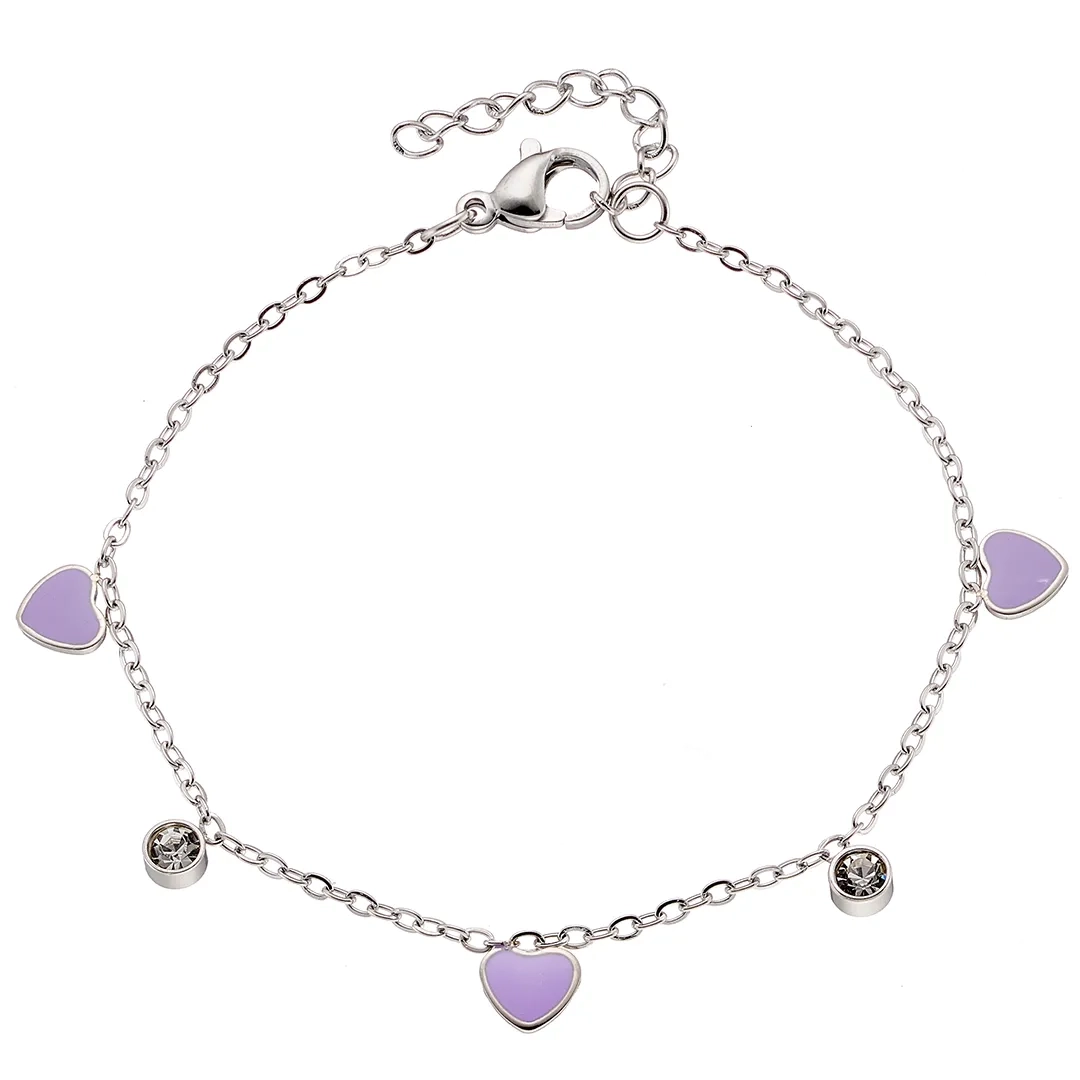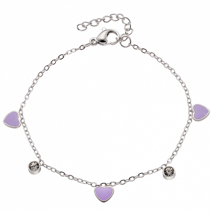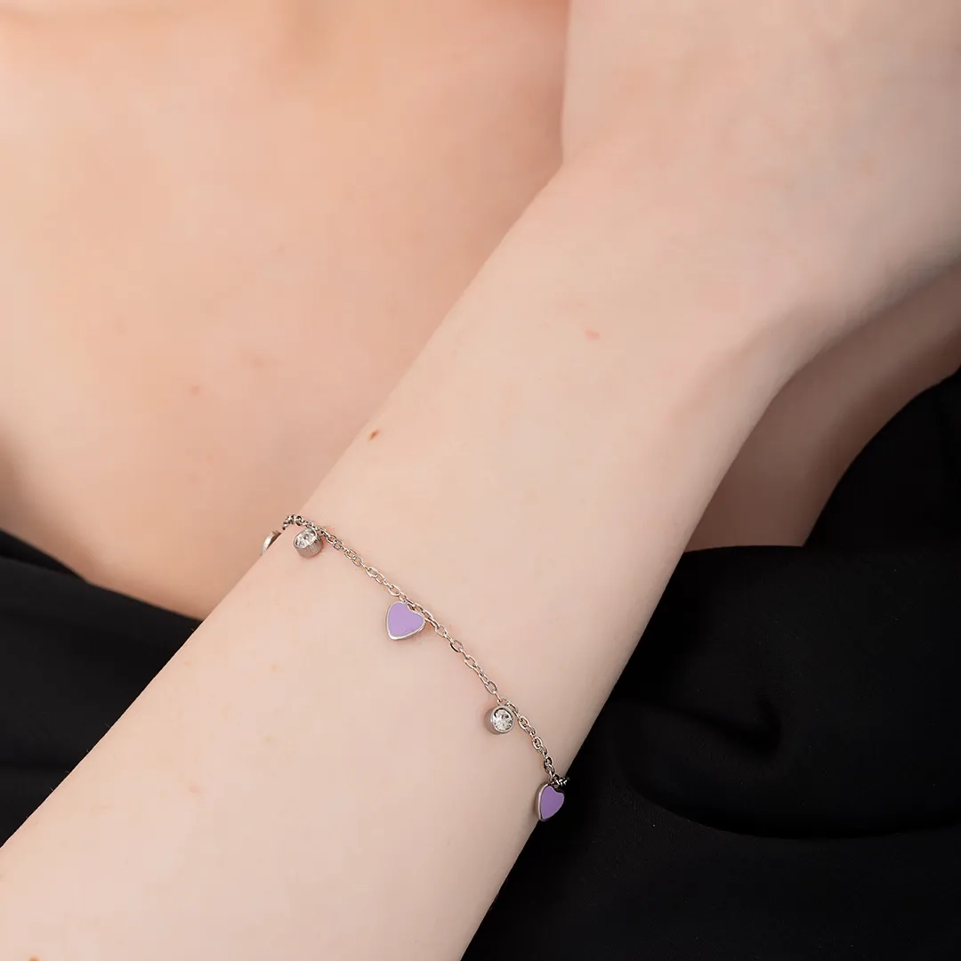 Oxzen γυναικείο βραχιόλι ατσάλινο με κρεμαστές μωβ καρδούλες