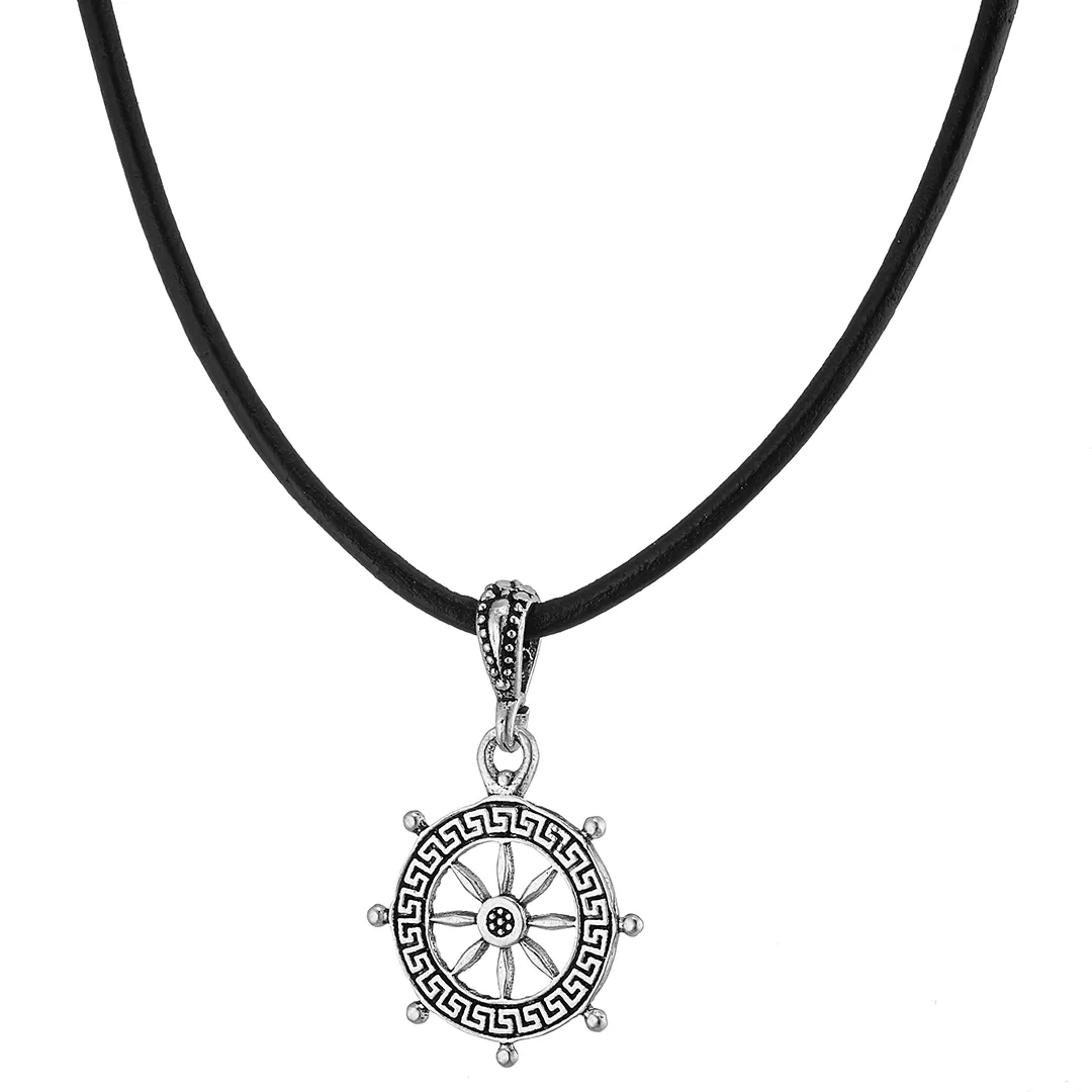 Oxzen κολιέ από ασήμι, τιμόνι πλοίου με δέρμα με ασημένια κουμπώματα