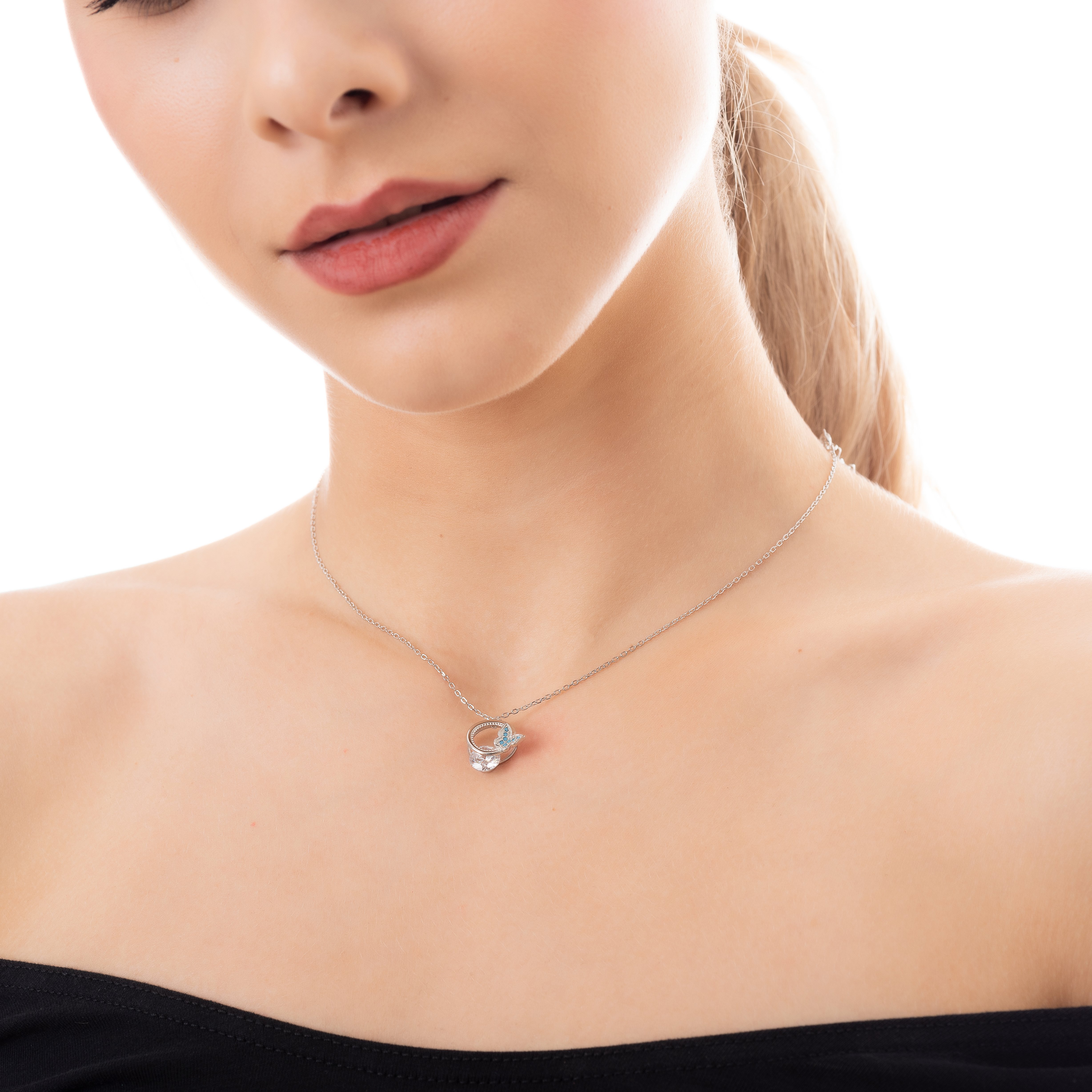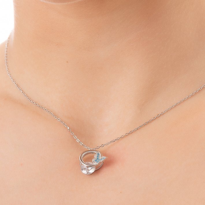 Oxzen κολιέ ασημένιο με πέτρα ζιργκόν και γαλάζια πεταλούδα