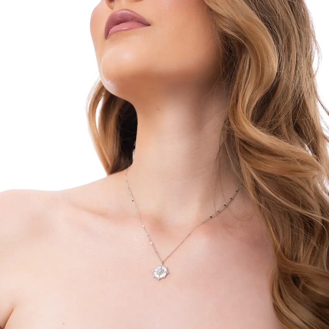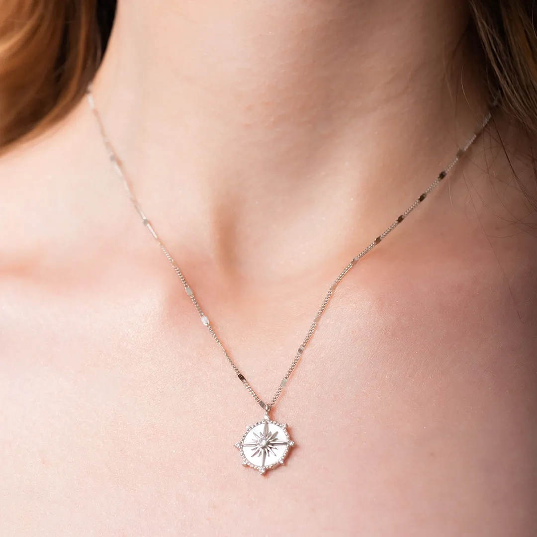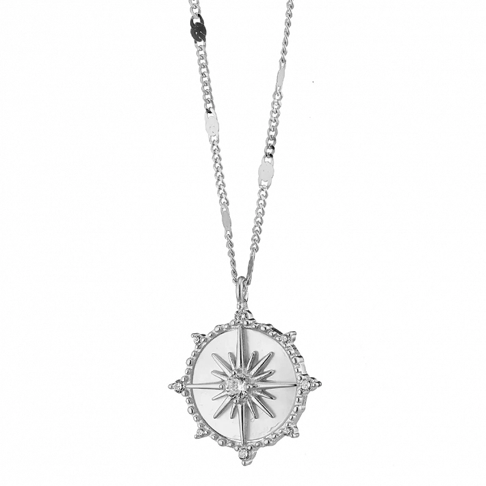 Oxzen κολιέ ασημένιο πυξίδα με φίλντισι και λευκά ζιργκόν