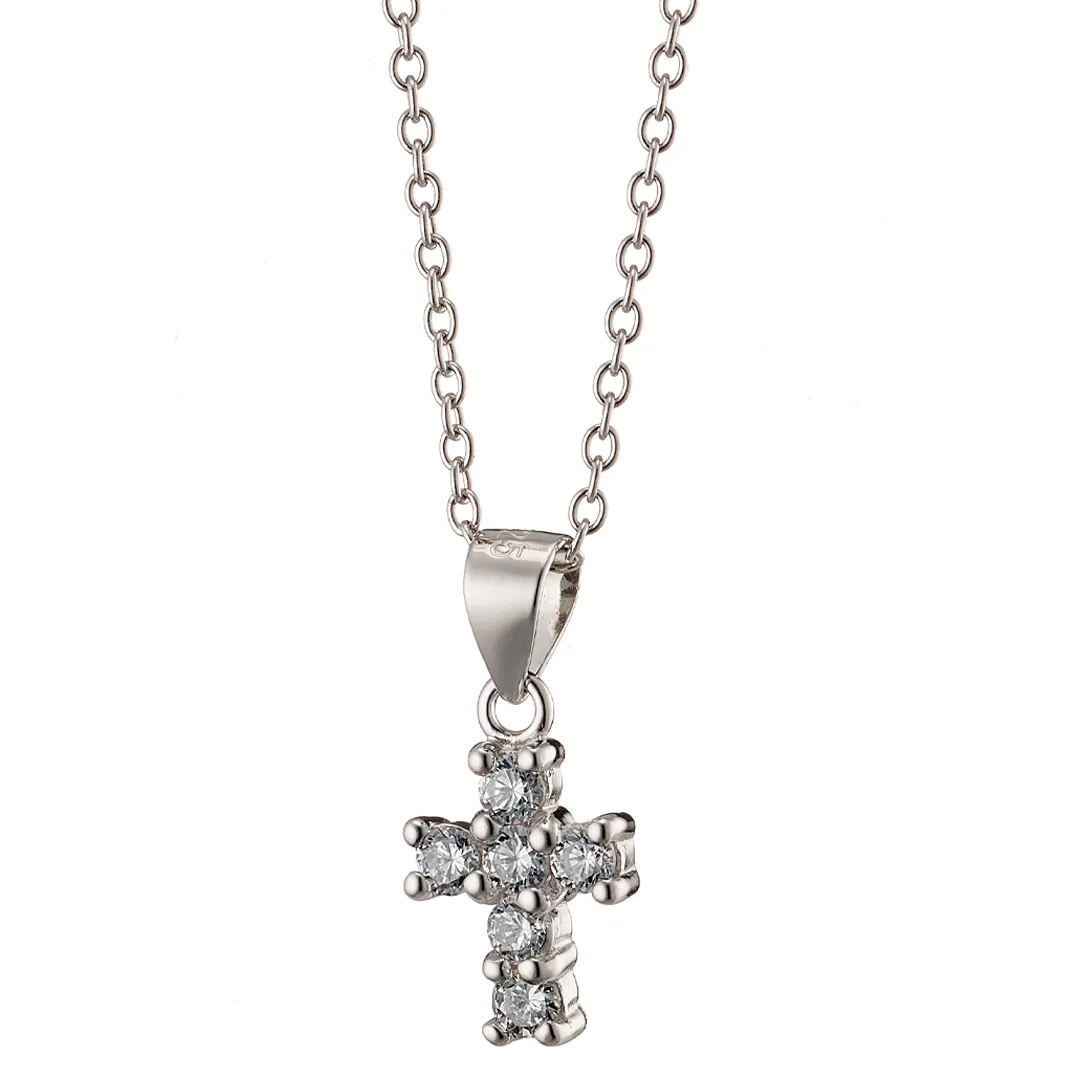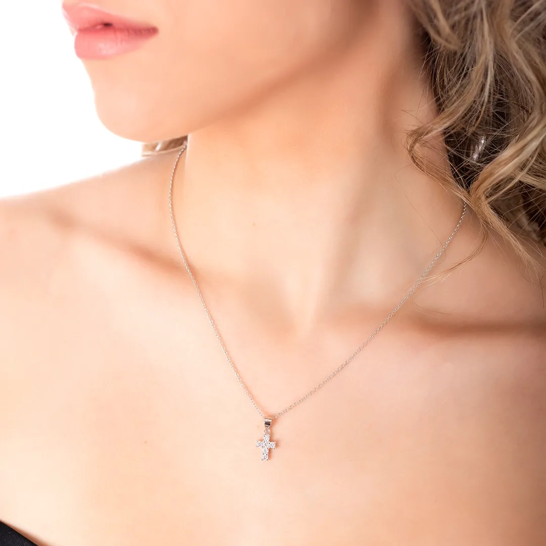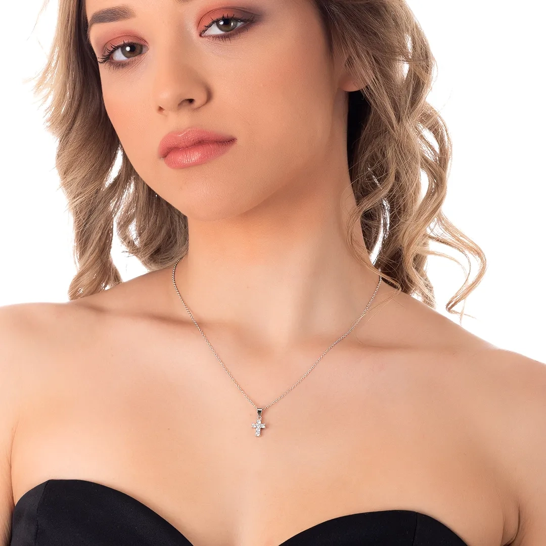 Oxzen κολιέ σταυρός ασημένιος μικρός με λευκά ζιργκόν