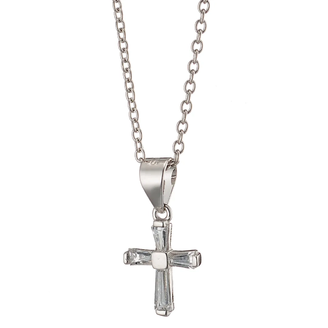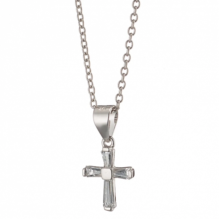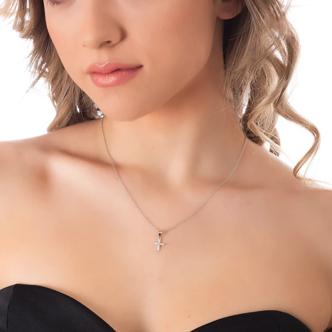 Oxzen κολιέ σταυρός ασημένιος μικρός με λευκές παγιέτες ζιργκόν