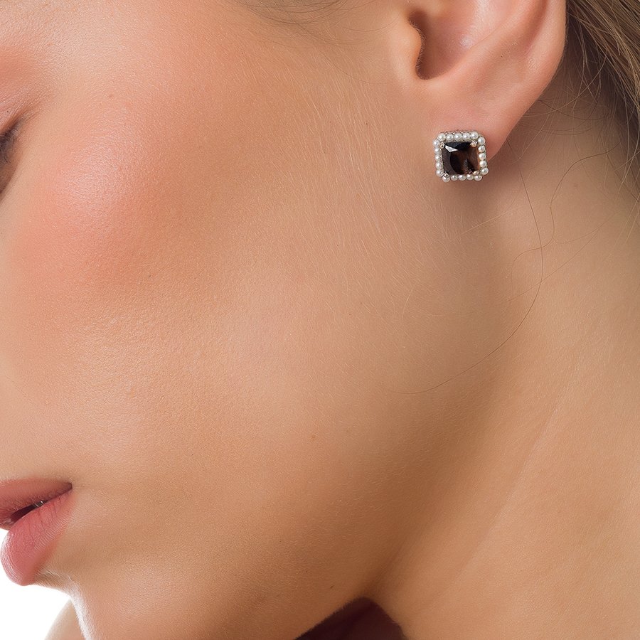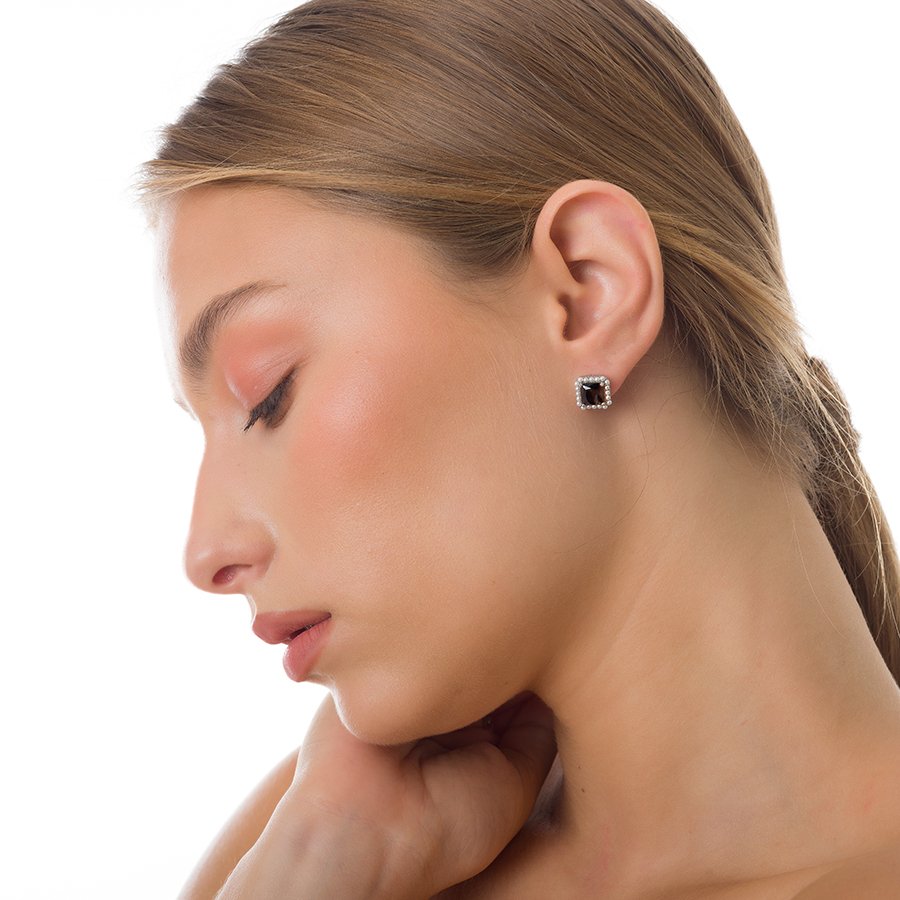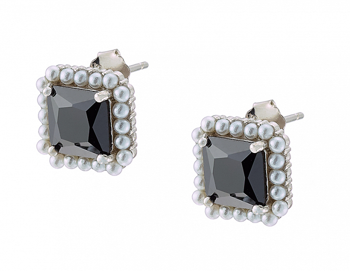 Oxzen σκουλαρίκια καρφωτά ασημένια τετράγωνο με περλίτσες και μαύρο ζιργκόν