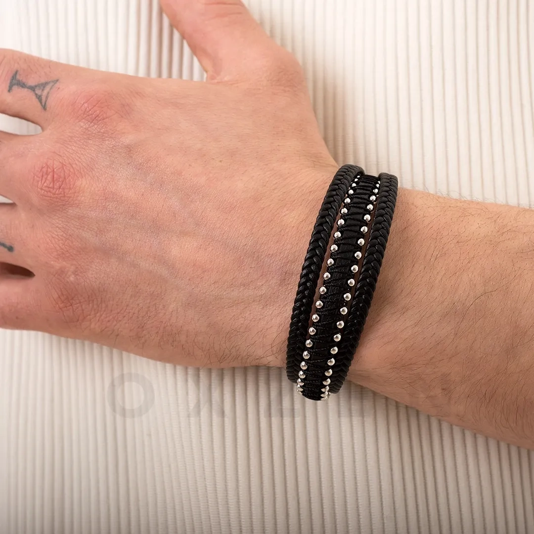 Βραχιόλι ατσάλινο με δέρμα μαύρο πενταπλό