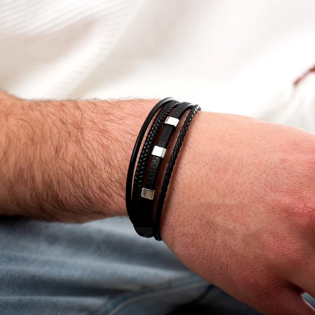 Βραχιόλι ατσάλινο με μαύρο δέρμα τριπλό