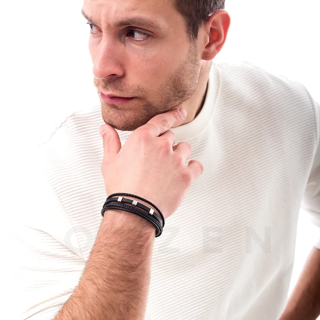Βραχιόλι ατσάλινο με δέρμα μαύρο πενταπλό