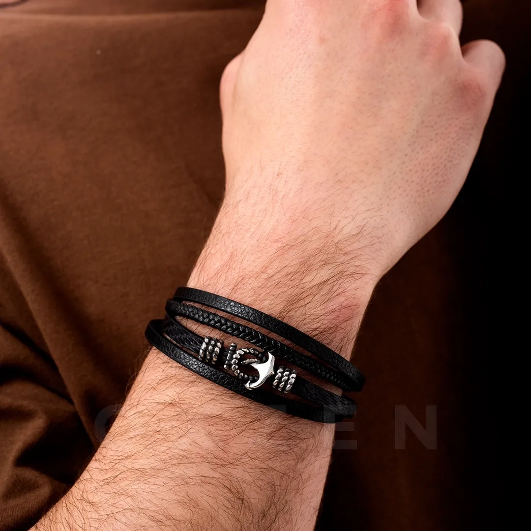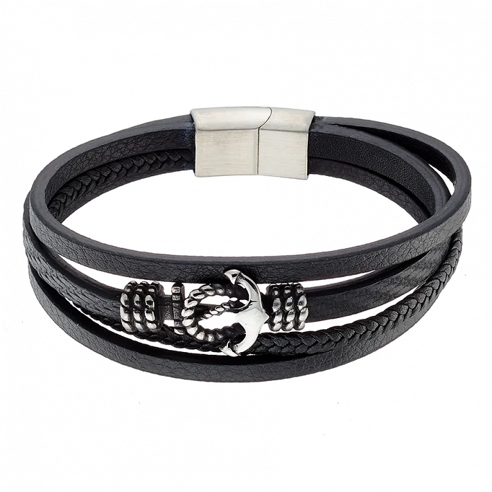 Βραχιόλι ατσάλινο με μαύρο δέρμα και άγκυρα
