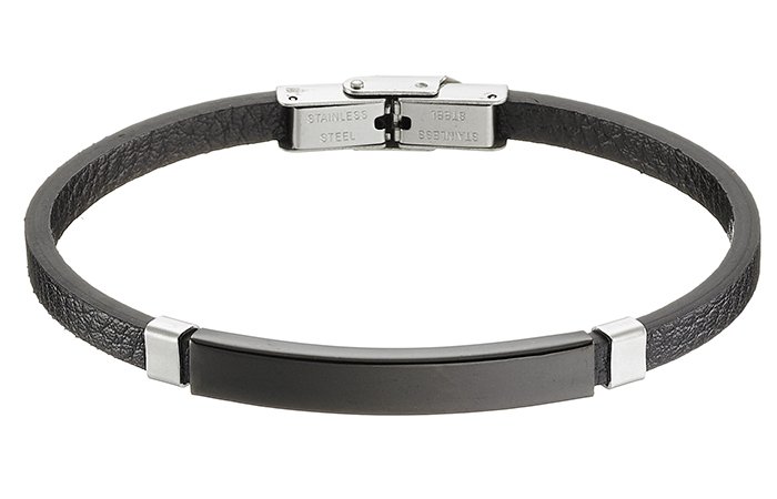 Βραχιόλι ατσάλινο με δέρμα PU ταυτότητα ασημί με μαύρο