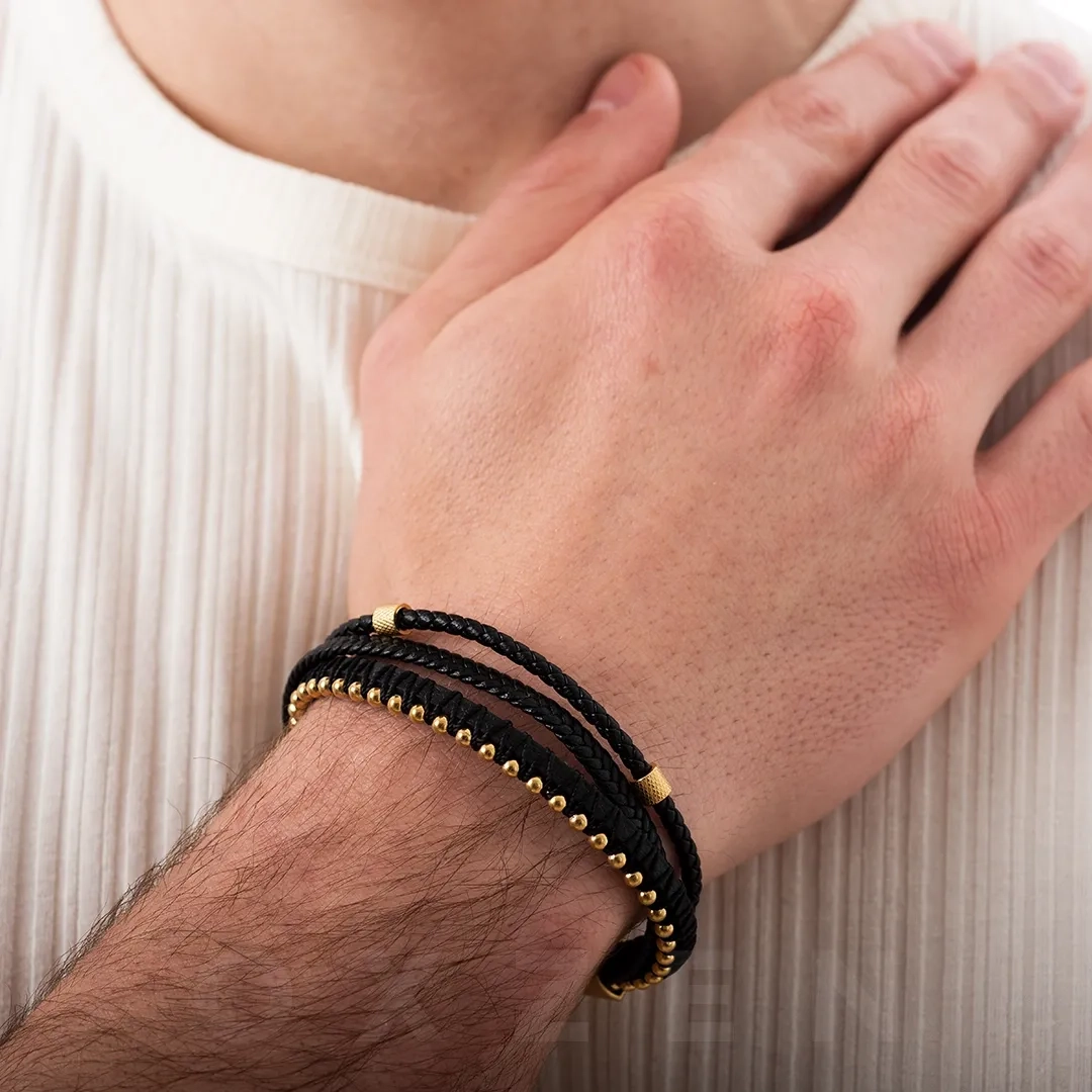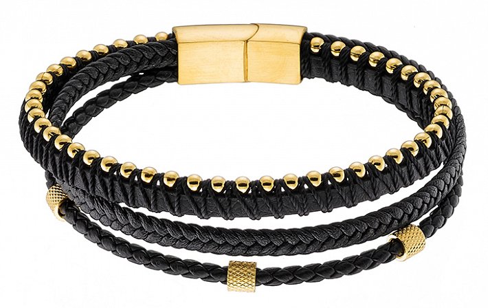 Βραχιόλι ατσάλινο με δέρμα μαύρο πενταπλό