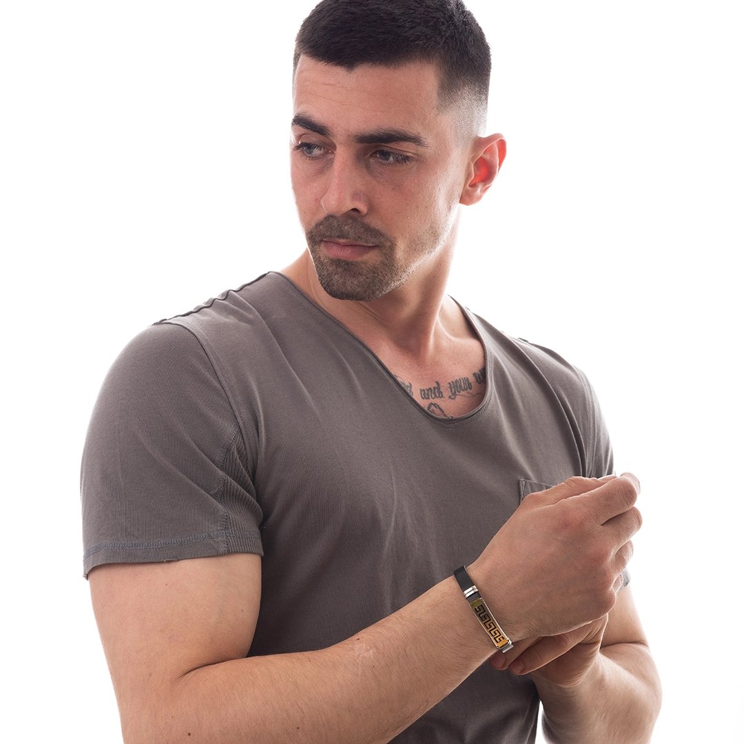 Βραχιόλι ατσάλινο με δέρμα PU ταυτότητα ασημί με μαύρο