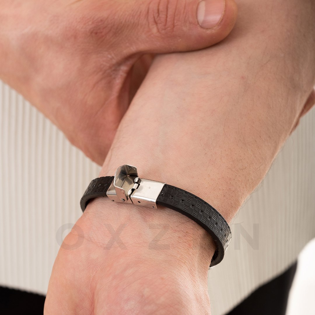 Βραχιόλι ατσάλινο με δέρμα PU ταυτότητα ασημί με μαύρο