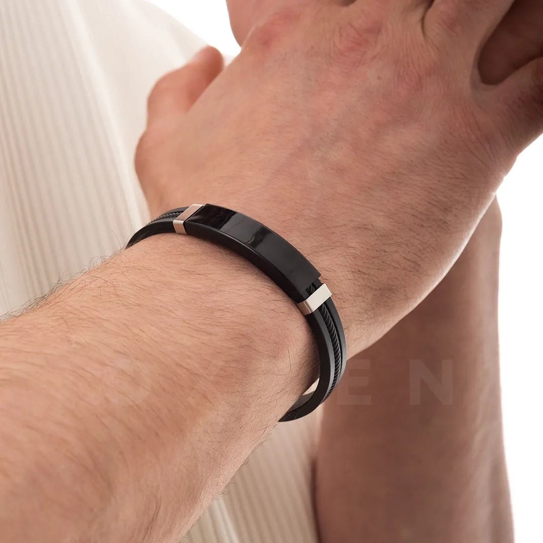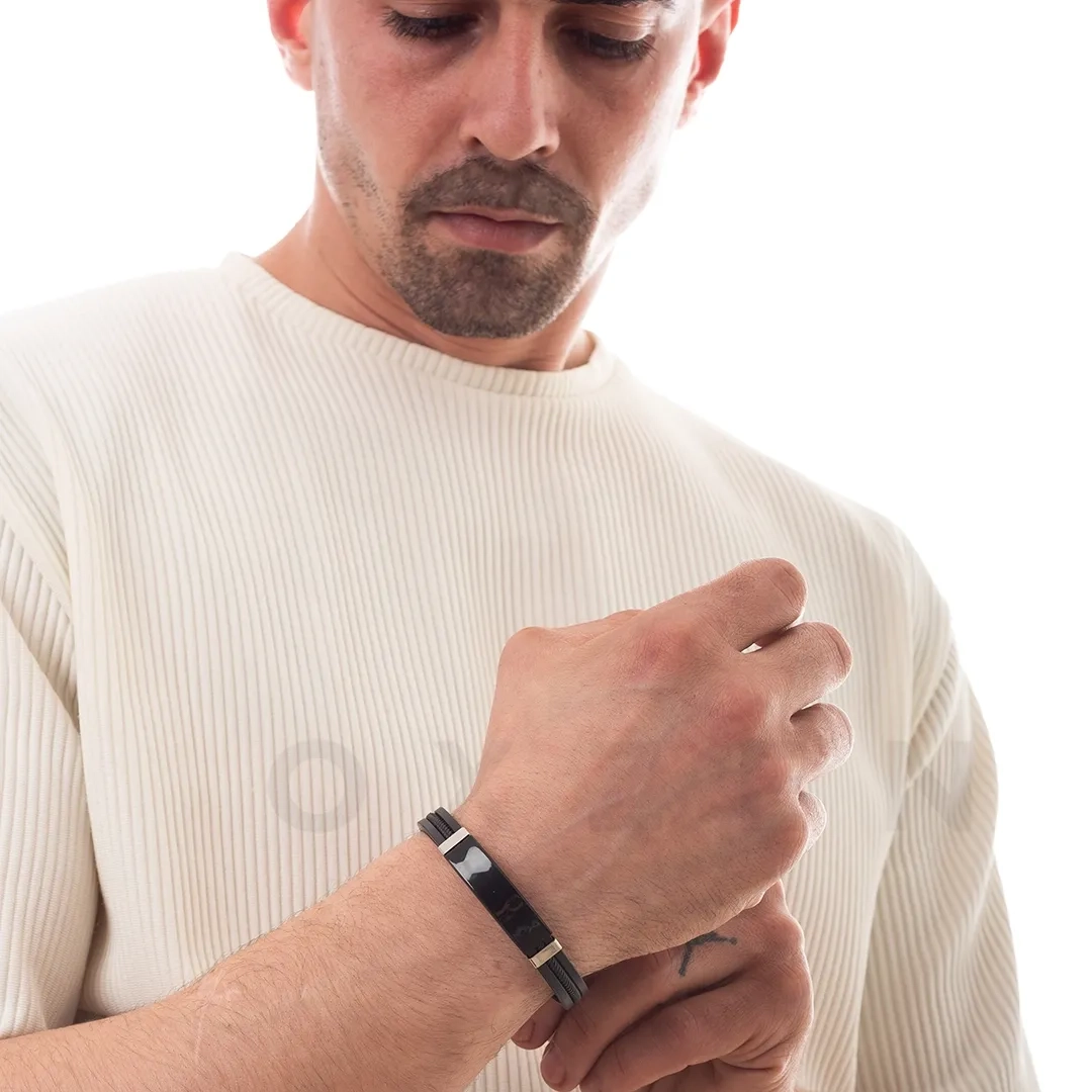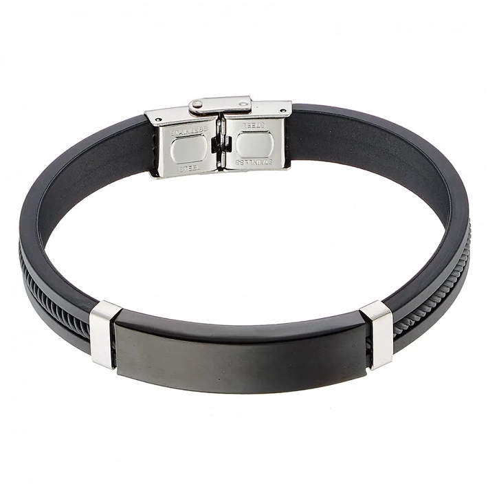 Βραχιόλι ατσάλινο με δέρμα PU ταυτότητα ασημί με μαύρο