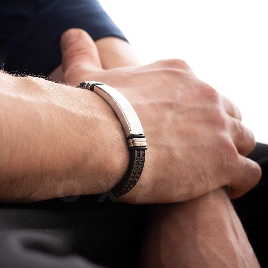 Βραχιόλι ατσάλινο με δέρμα PU ταυτότητα ασημί με μαύρο