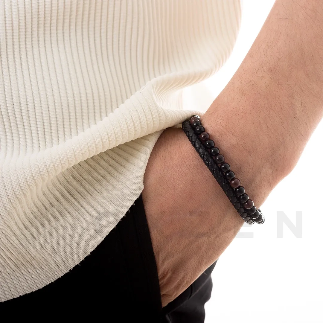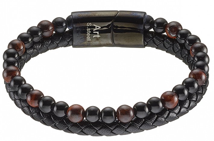 Βραχιόλι ατσάλινο με μαύρο δέρμα διπλό με ορυκτές πέτρες