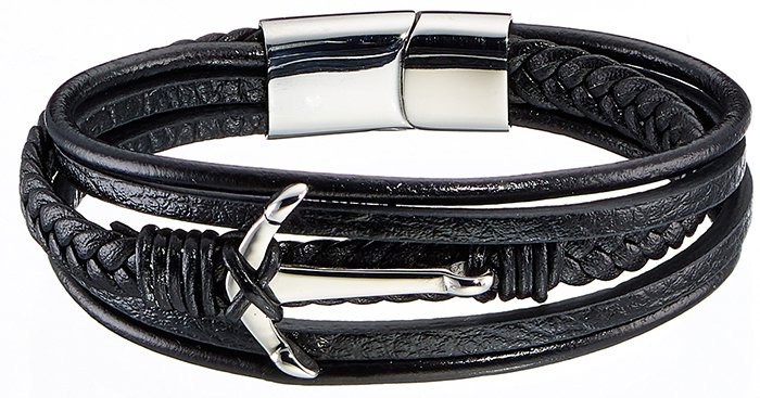Βραχιόλι ατσάλινο με μαύρο δέρμα και άγκυρα