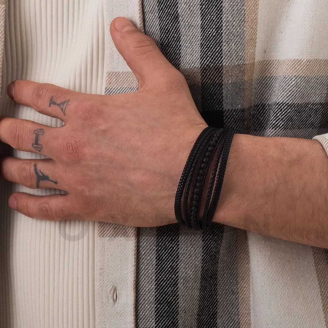 Βραχιόλι ατσάλινο με μαύρο δέρμα πενταπλό και πέτρες λάβας